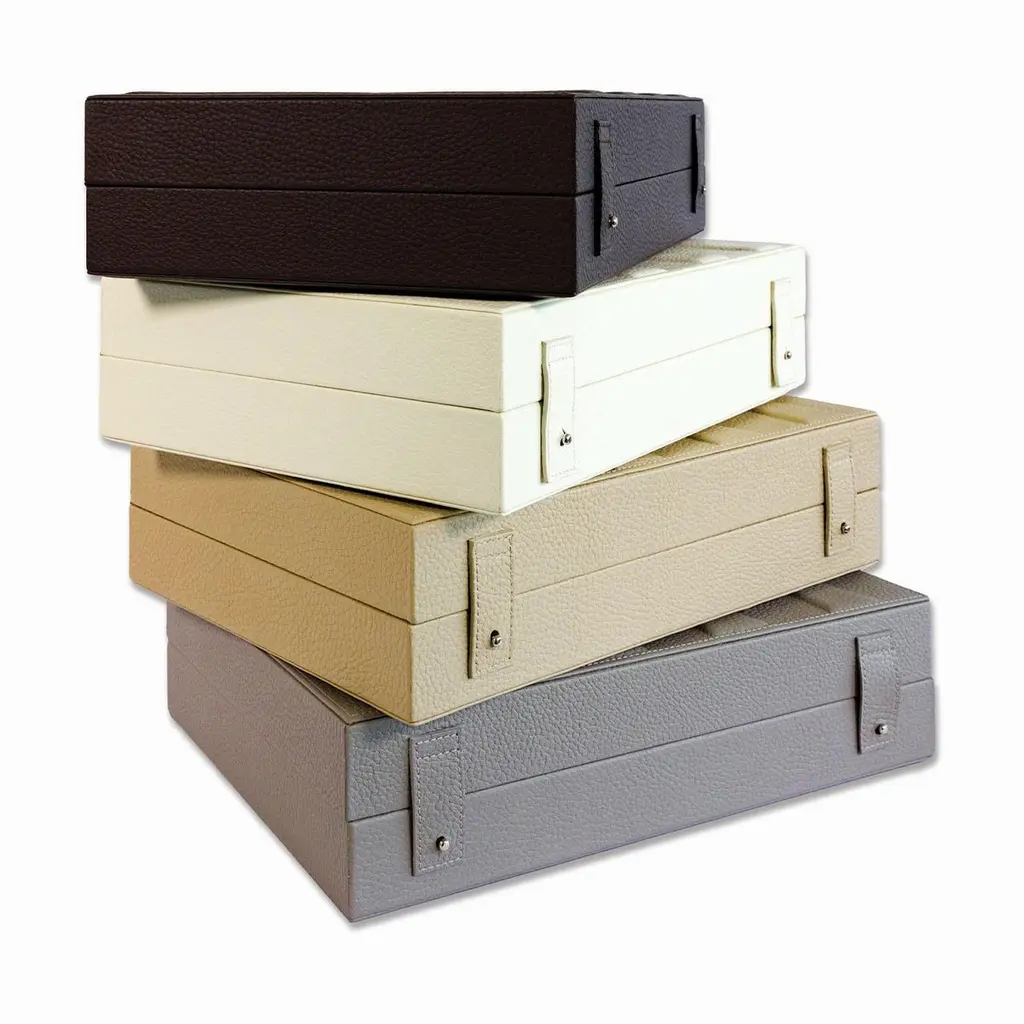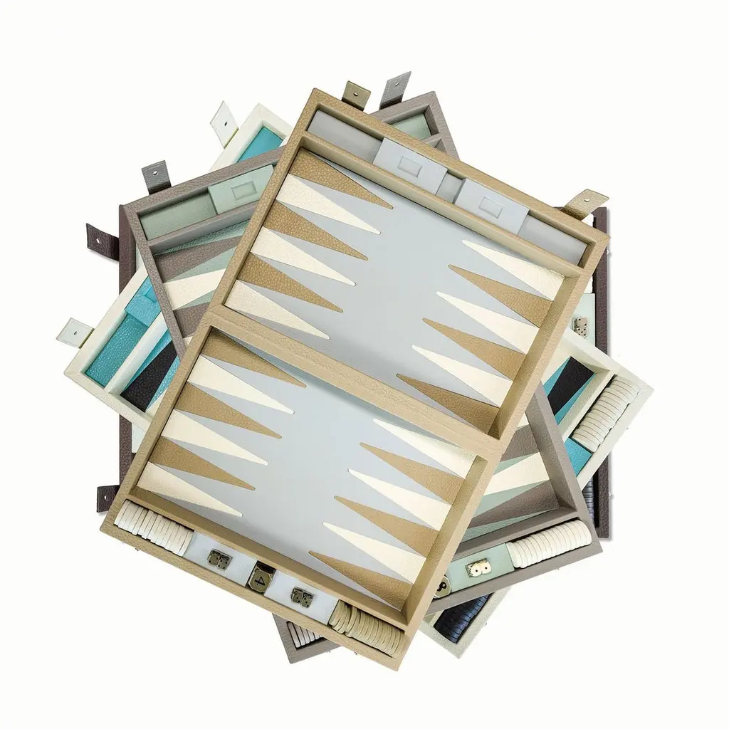 Wooden handmade backgammon game dressed in fine and soft genuine leather with brass dice in palladium plating. Available in different colors. Please, ask the Concierge for further details.