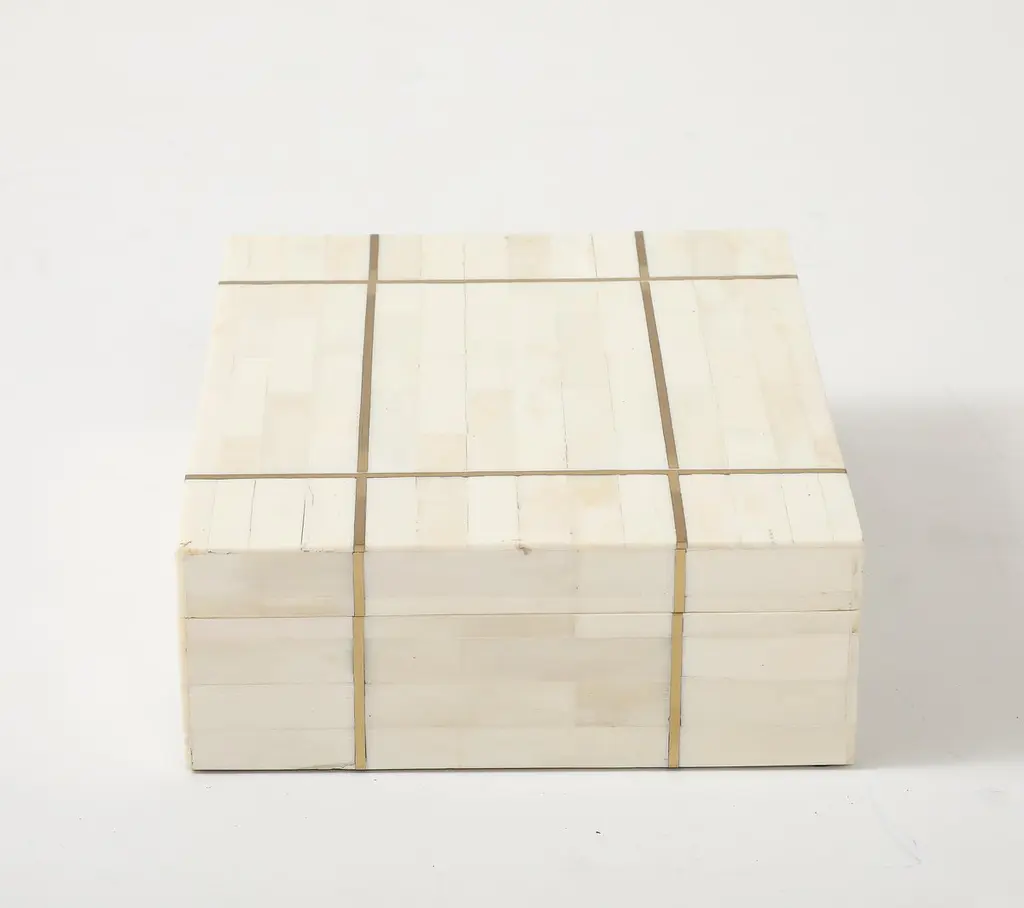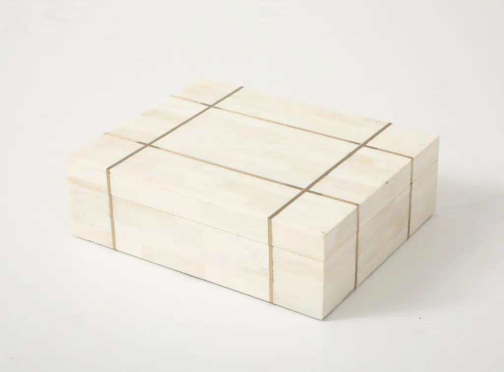 Handmade decorative keepsake, desk box clad in white bone and brass inlay pinstripes.