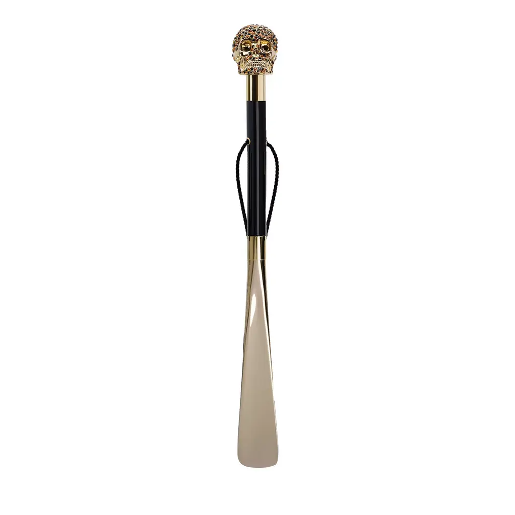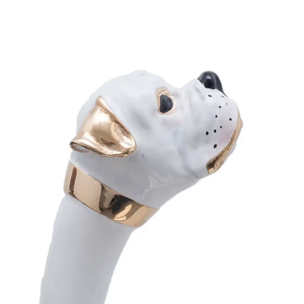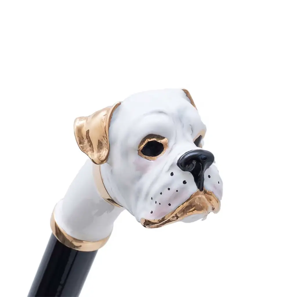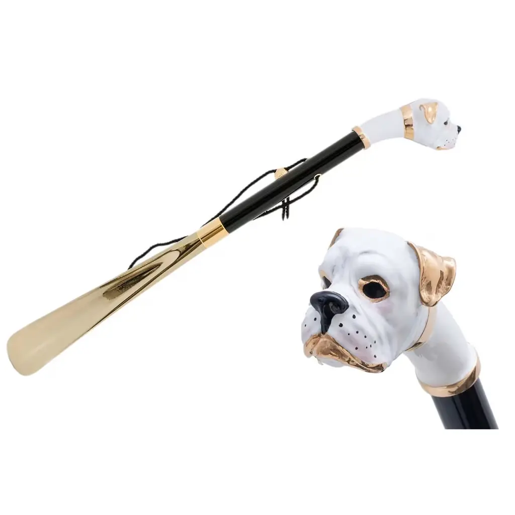 The elegant, 50 cm long White Boxer Shoehorn is a sophisticated accessory entirely handmade in Italy. The enameled brass handle represents the head of a boxer in white with brass trim, while the shaft is made from wood and the end in ABS.