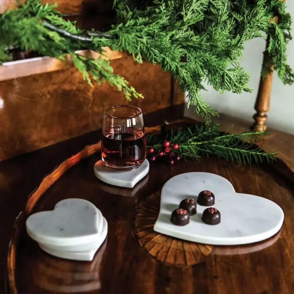 Add a bit of heart to cocktail hour. We had these coasters made just for us to match the slightly curvy silhouette of our Crystalline heart dishes. These sweet little hearts are an invitation to bring the unique beauty and natural coolness of carved marble to your table. At Simon Pearce, fine glassware is still hand-blown in the traditional style. Simon Pearce opened his first glassblowing shop in 1971 in Kilkenny, Ireland. Ten years later, the factory was moved to Quechee, Vermont, where it remains today. The Ottauquechee River provides clean, hydroelectric power for the facility. All Simon Pearce items are proudly made in the U.S.A.