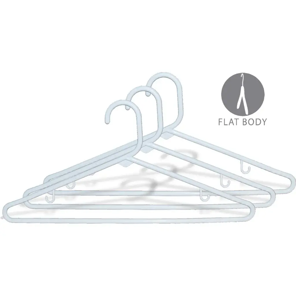Hang your wardrobe efficiently with this pack of 144 white plastic hangers. The simple tubular design holds your clothes securely and has a slim profile that will help maximize your closet space. These economical hangers have fixed hooks and strong construction for reliable use. Dimensions: 8 inches high x .25 inches wide x 16.38 inches long Material: Plastic Color: White