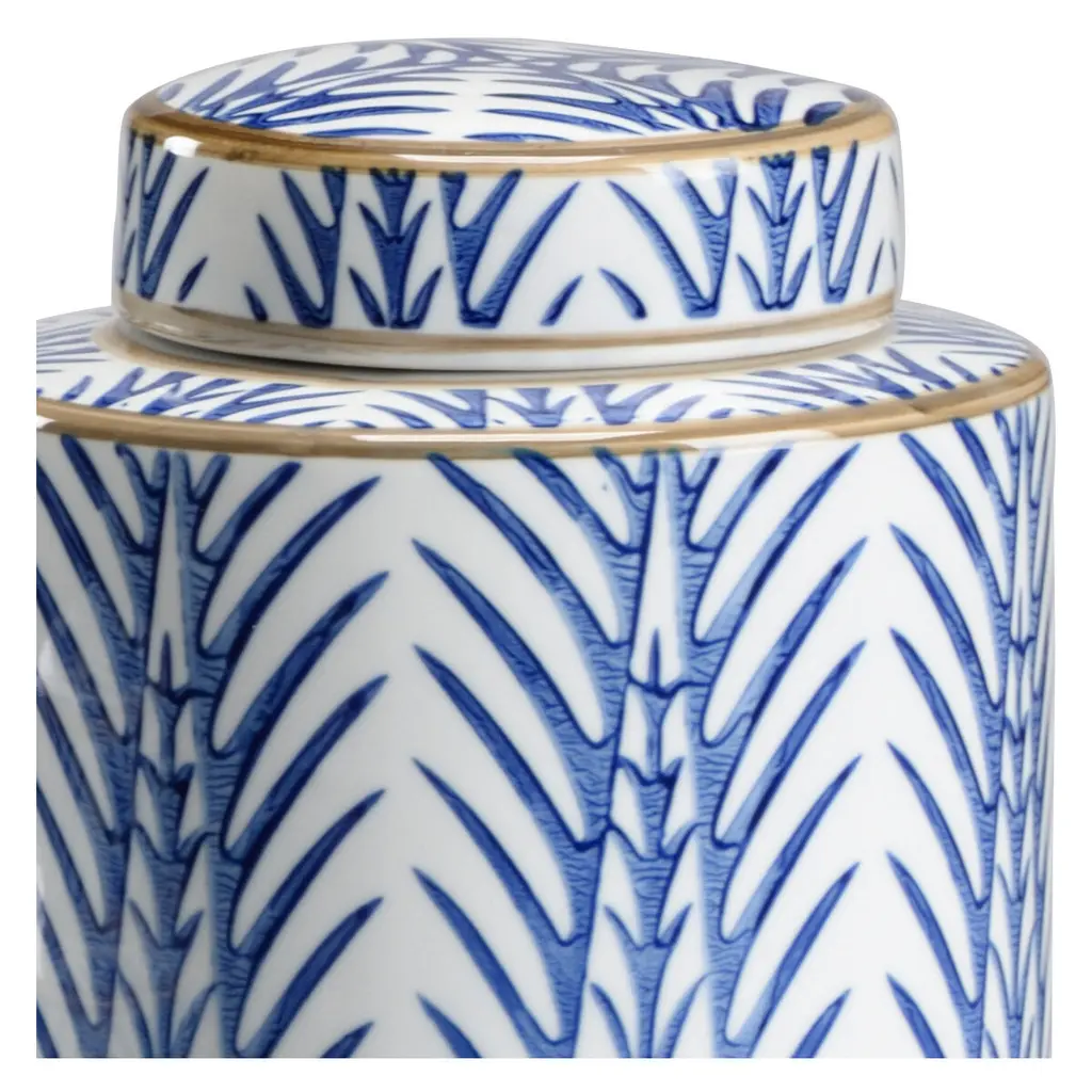 BLUE FRONDS CANISTERS (S3). SET OF THREE PORCELAIN CANISTERS WITH BLUE AND WHITE FROND PATTERN SMALL 7"H X 7.75W X 7.75D MED 11"H X 7.75W X 7.5D LARGE 15.25"H X 7.75W X 7.75D