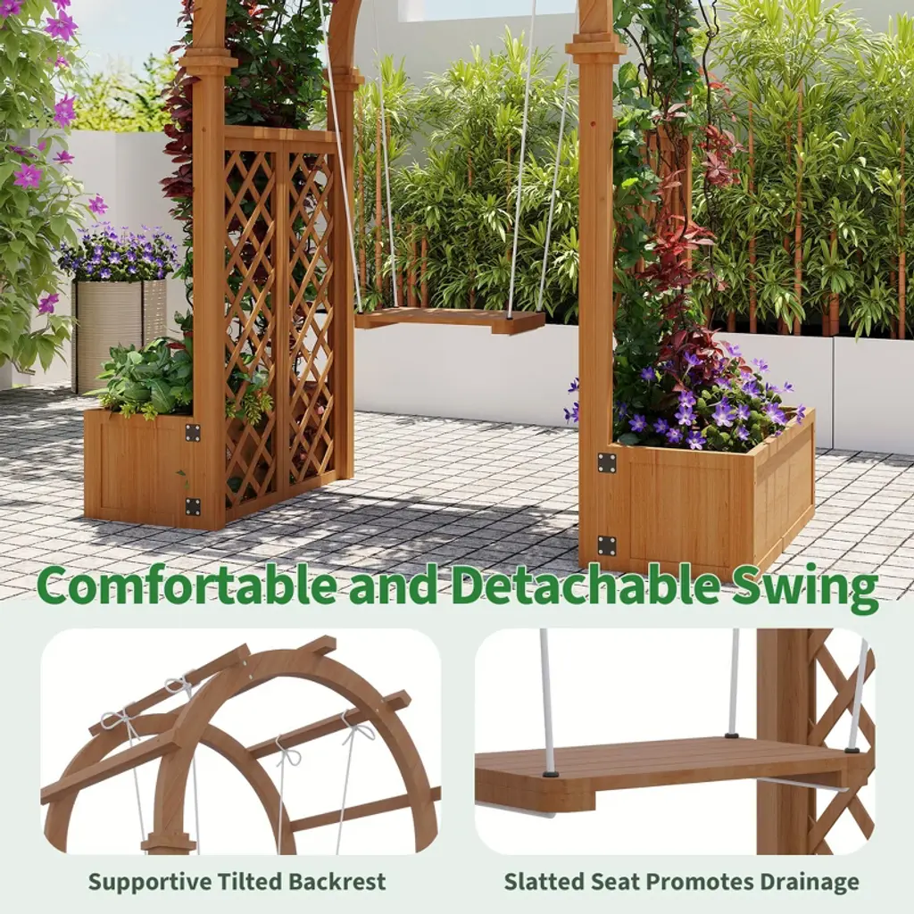 Wood Garden Arbor with Planter Boxes and Swing - Outdoor Arch Trellis with Pergola for Climbing Plants Vines Grapes - Backyard Decor, Party, Weddings