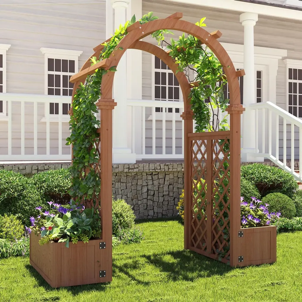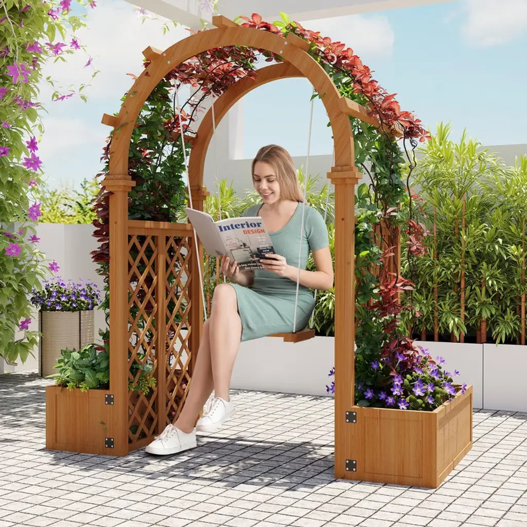 Wood Garden Arbor With Planter Boxes And Swing - Outdoor Arch Trellis With Pergola For Climbing Plants Vines Wood
