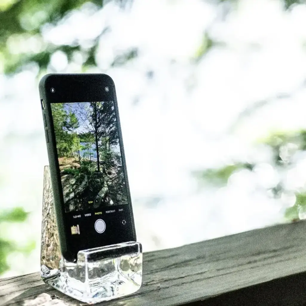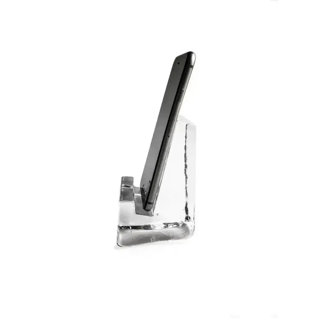 An ideal companion to our Woodbury Clock, this handcrafted glass phone holder fits most mobile phones and tablets, making conference calls a pleasure, at your desk and beyond. It doubles a beautiful, functional kitchen assistant: keeping digital recipes on your device close at hand. At Simon Pearce, fine glassware is still hand-blown in the traditional style. Simon Pearce opened his first glassblowing shop in 1971 in Kilkenny, Ireland. Ten years later, the factory was moved to Quechee, Vermont, where it remains today. The Ottauquechee River provides clean, hydroelectric power for the facility. All Simon Pearce items are proudly made in the U.S.A.
