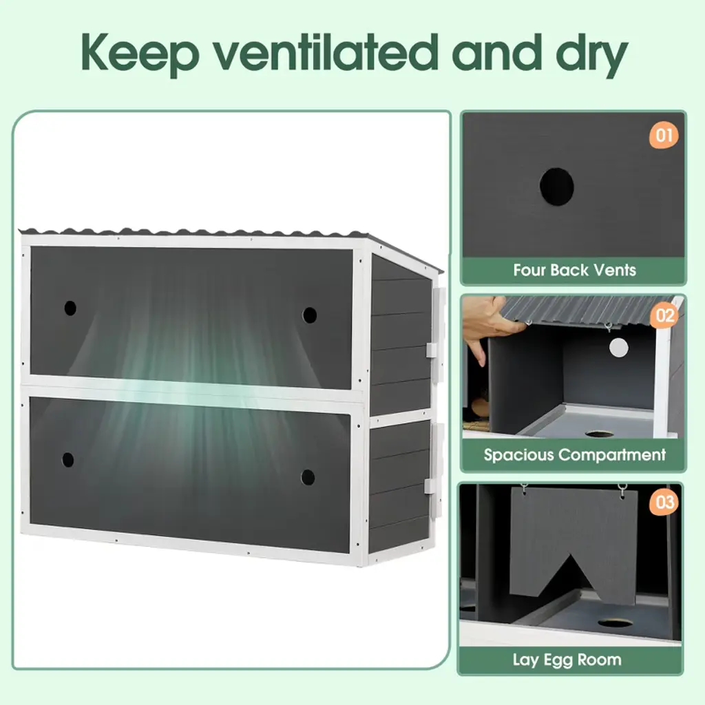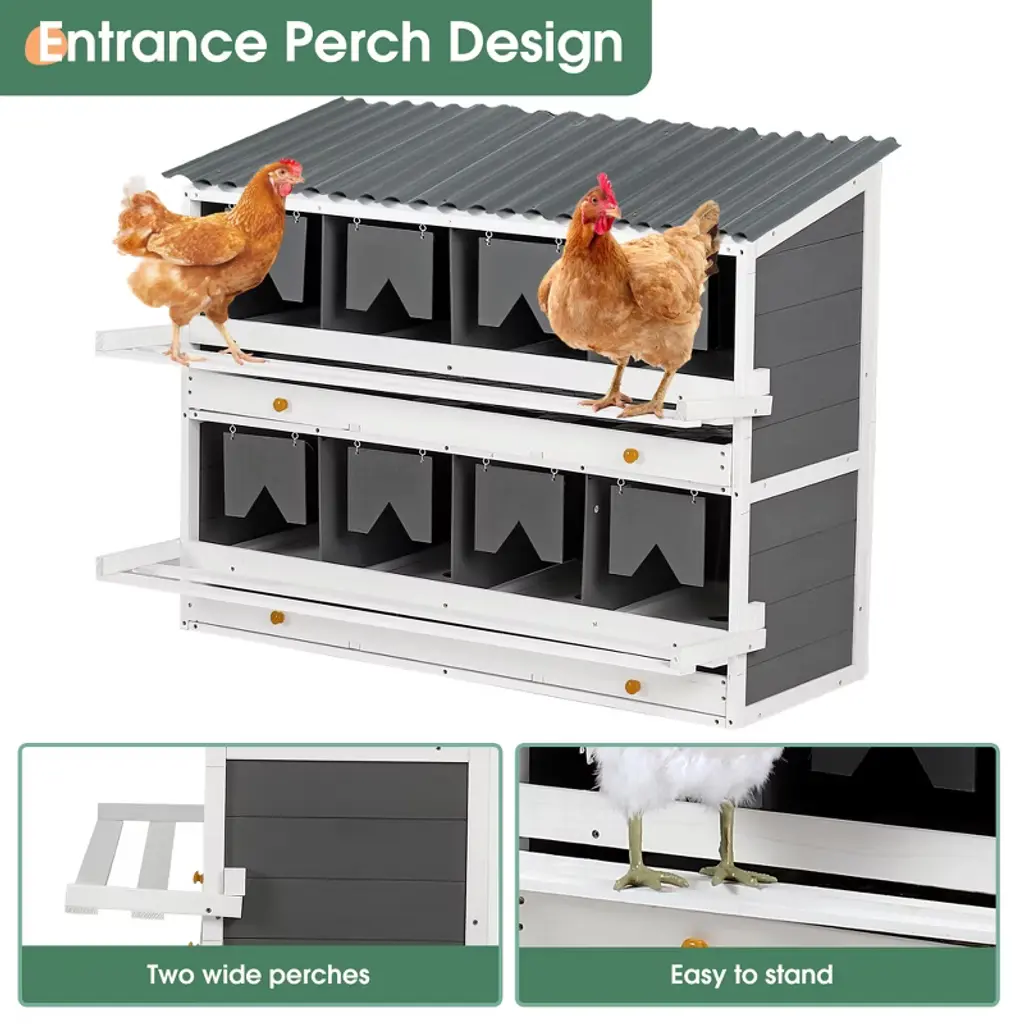 Product informationName: Wooden Chicken Nesting BoxMain Material: Hard WoodColor: White+GrayProduct Dimensions:47.00x26.40x35.40inProduct Weight:51.81lbNumber of packages:1Package Size:50.20x14.37x19.88inPackage Weight:56.22lbsPacking list: 1 x Wooden Chicken Nesting BoxProduct DescriptionPremium Wooden Chicken Nesting Box - Comfort & Efficiency: Give your hens a clean, secure, and inviting space to lay with this durable pine nesting box. Its 8 spacious compartments (11" each) comfortably house large hens, while thoughtful details like a sloped PVC roof (prevents perching and water pooling) and rear ventilation ensure freshness. The innovative roll-away design gently collects eggs into a front drawer, making daily collection effortless and clean. Easy to assemble and built for lasting use, this naturally warm wooden nesting box supports happier hens and simplifies your coop management. Dimensions: 47" L x 26.4" W x 35.4" H.Notes:Manual measurement has been used,there may be some reasonable error.All the pictures are taken by actual samples, slight chromatic aberration may occur due to lighting or display.