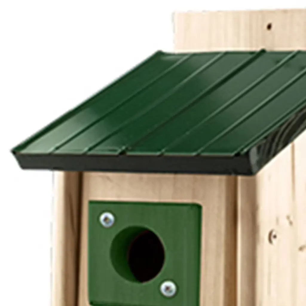 Give your backyard birds a beautiful, cozy retreat with the Woodlink Bluebird Cedar Nesting Bird House. This nesting box has been designed to attract Bluebirds to its homey walls. Made of natural cedarwood, this material is resistant to rot from the weather and is assembled with rust-resistant screws. This makeup ensures that this birdhouse can withstand temperature changes throughout the seasons. This nesting box features a predator guard to ensure that this extended entrance protects baby birds. The easy-open latch allows you to easily peek into the nesting box to check on the progress of the nesting birds, and for you to easily access the box to clean it out. The nesting box is vented, with a 0.5-inch air ventilation drain hole at the base. Hang the birdhouse near your deck or patio, or place the birdhouse out by your garden. The metal roof is painted forest green to blend in with the environment. Other birds will be attracted to this nesting box too, so rest assured that wild birds will enjoy this safe place. Enhance your garden decor and create a safe place for birds to roost with the Woodlink Bluebird Cedar Nesting Bird House.