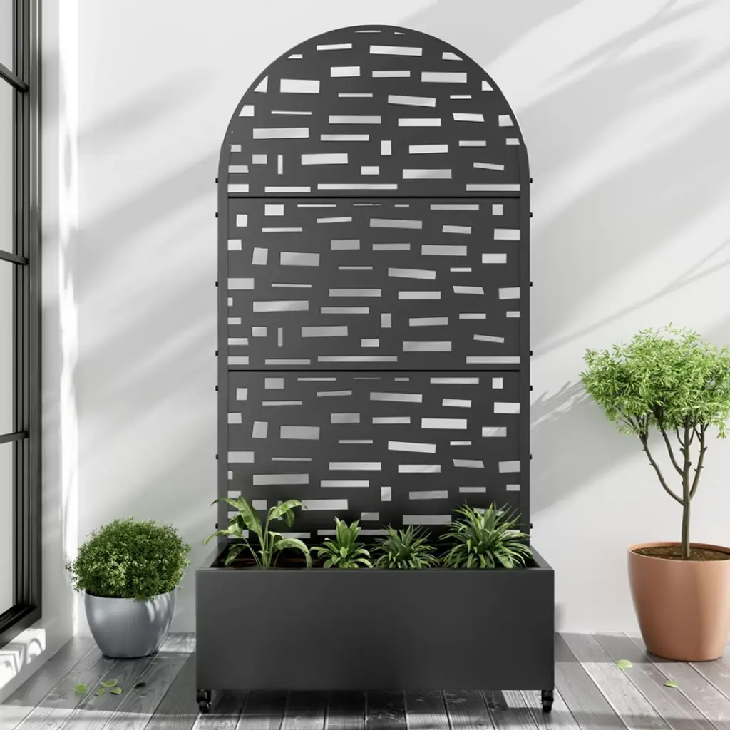 This elegant outdoor planting box boasts a distinctive wide edge, offering extra space for creative planting along its rim. Crafted from durable black wrought iron, it promises long-lasting strength against the elements. The integrated climbing frame is a standout feature, providing essential support for vibrant vines, climbing flowers, or trailing plants to gracefully ascend. Perfect for patios, balconies, or garden corners, this freestanding planter combines sturdy construction with stylish design, adding both functionality and visual interest to your outdoor space.