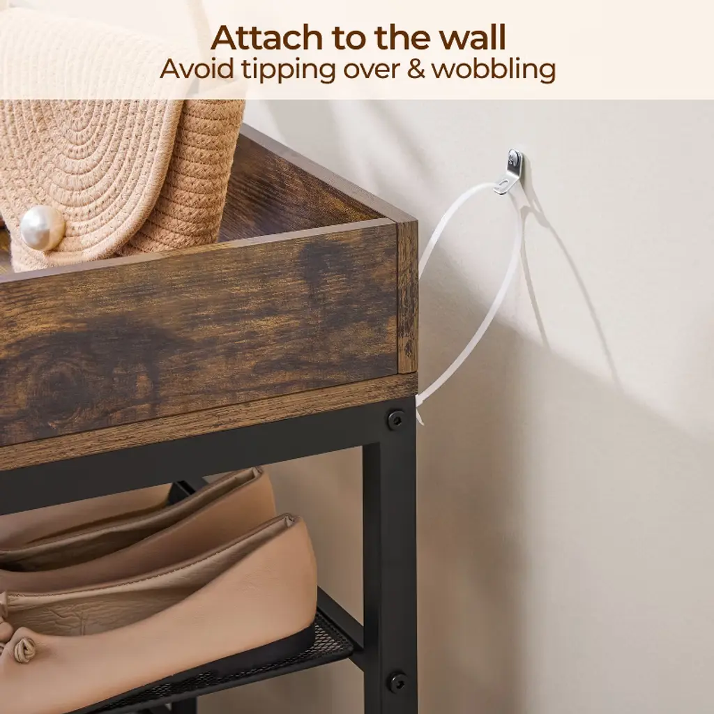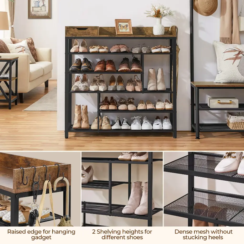 This 6-tier entryway shoe rack features a dark rustic wood top with a platform and drawer and a 5-tier metal mesh shelf in different lengths. The mesh shelf adds an airy expression to the storage organizer by reducing the color saturation of the all-black color. While the rustic brown-black work as a classic color match of industrial decor style, which can be suited in many different decor styles. The storage shelves in different lengths can be the perfect solution for the arrangement of the shoes with higher bootlegs. In addition, the 5-tier shelf is spacious for your whole season's shoes. Specifications: Materials: Veneered Particle Board, Powder-Coated IronAssembled Dimensions: 39.5″ L × 12″ W × 39.5″ HAvailable Shelf Heights: 5″/6.3″/13″Storage Box Inner Dimensions: 11″ L × 10.7″ W × 3″ H Top: 11″ L × 27″ WMaximum Weight Capacity: Top and Each Large Mesh Shelf: 18.7 lbSmall Mesh Shelf: 13.2 lb Please see the image for exact measurements.Please allow a 1/2″ measurement tolerance.Please make sure the wall anchors are properly installed before use.
