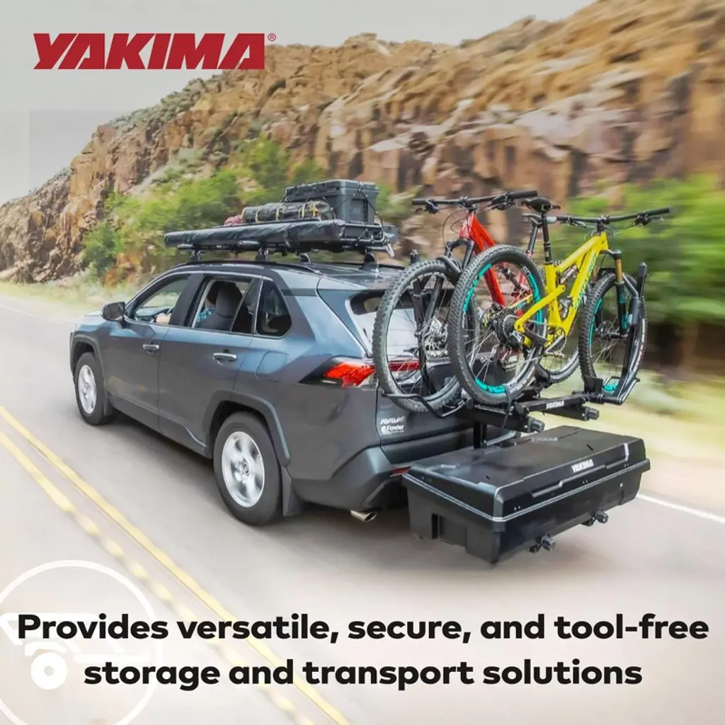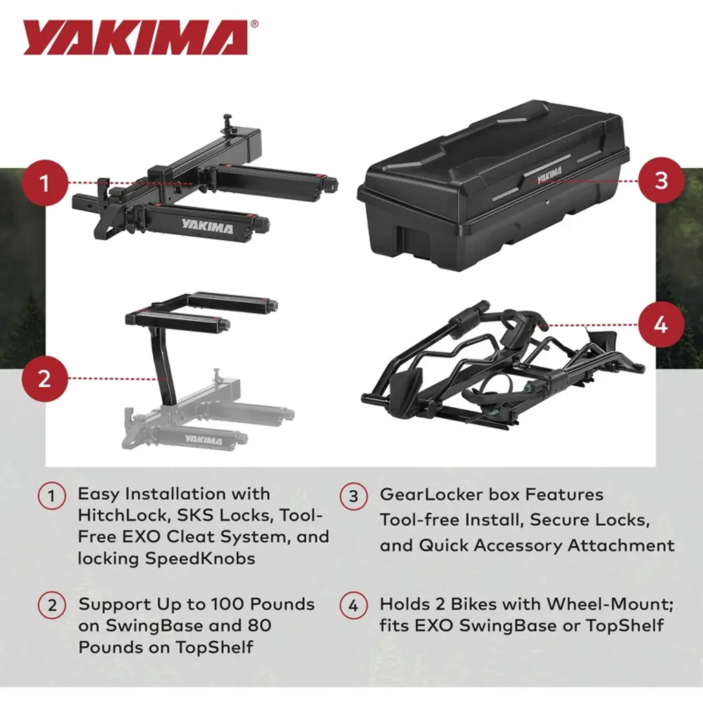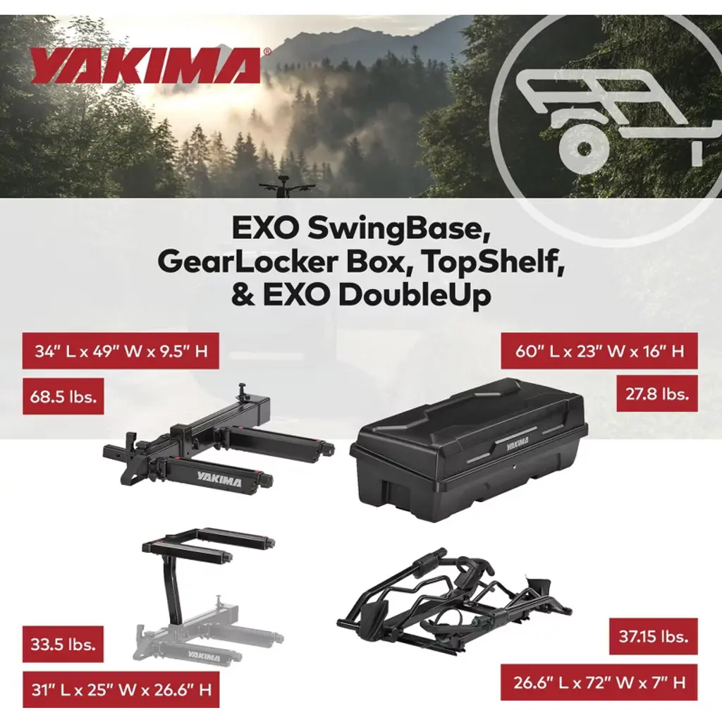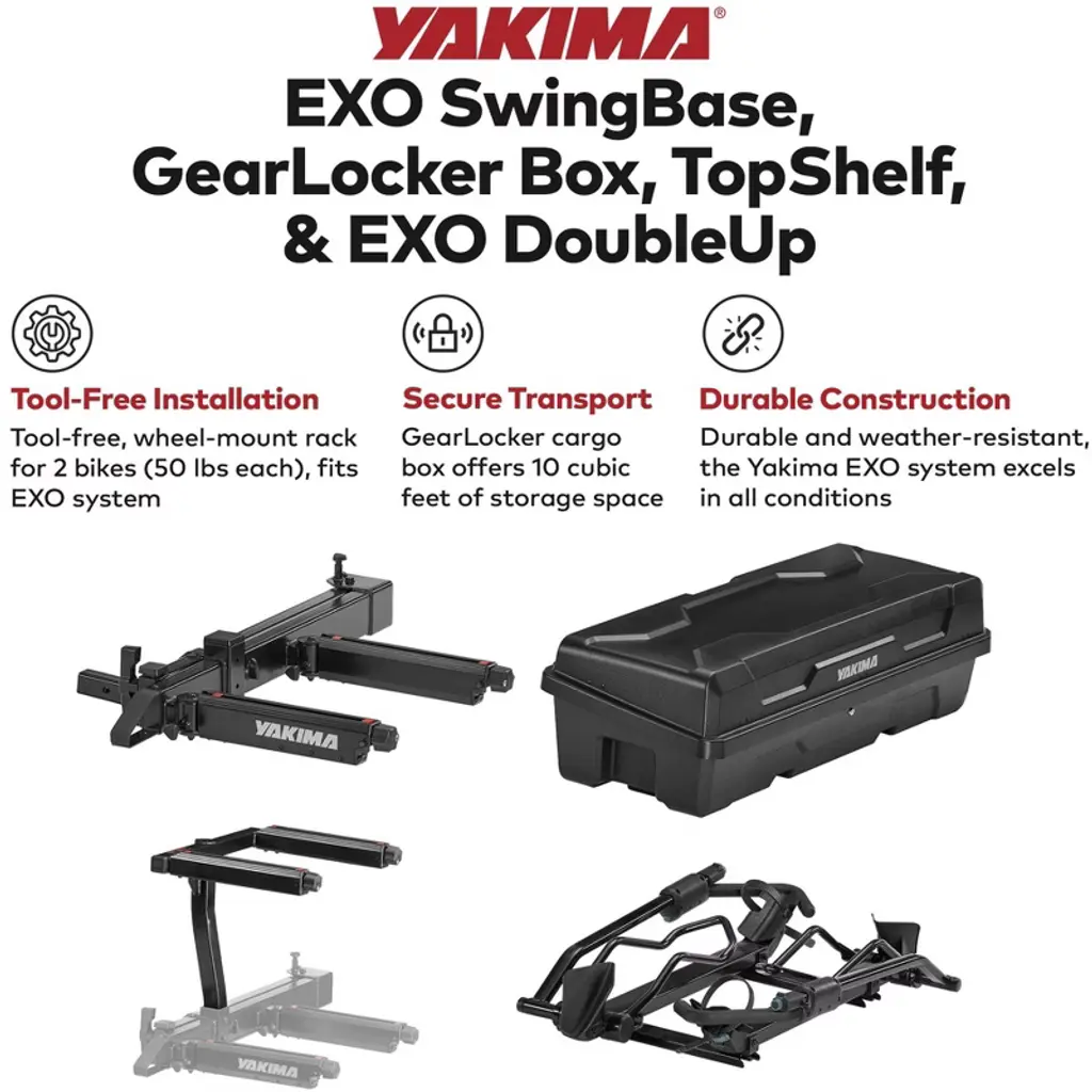 Embark on thrilling adventures with the Yakima EXO SwingBase Hitch Rack, GearLocker Cargo Box, and TopShelf Rack, and DoubleUp ensuring all your essentials are covered. The EXO SwingBase and TopShelf rack transforms your 2-inch hitch into a versatile platform for organizing gear. It supports activities like cycling, camping, and skiing, remaining on your vehicle for easy swapping of EXO accessories. These racks swing away from your car, even when loaded, providing quick rear access. Featuring a tool-free EXO Cleat system with locking SpeedKnobs, they offer easy installation and removal. Includes 2 extra SKS locks to secure gear for safe travels. Meanwhile, the EXO GearLocker is a hitch-mounted cargo box for the EXO Hitch Rack System, offering 10 cubic feet of storage. It attaches to your hitch and works with EXO SwingBase or TopShelf (sold separately), with weight limits of 100 pounds on SwingBase and 80 pounds on TopShelf. Features tool-free EXO Cleat System with locking SpeedKnobs for easy setup, and wide-angle opening for convenient loading. Optional EXO GearTotes (sold separately) add extra organization. The EXO DoubleUp is a versatile 2-bike carrier compatible with EXO SwingBase and EXO TopShelf. It expands gear capacity with options for GearLocker or GearWarrior below. Designed for all bike types, it ensures easy loading, integrating seamlessly with EXO SwingBase for pivot access or EXO TopShelf for secure bike storage. Built for durability and style, it safeguards bikes during transit while enhancing your outdoor setup. Unleash your adventurous side on your next journey with the Yakima EXO SwingBase Hitch Base Rack with GearLocker Cargo Box, TopShelf Rack and DoubleUp.