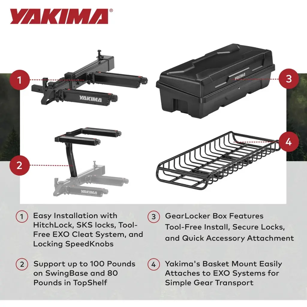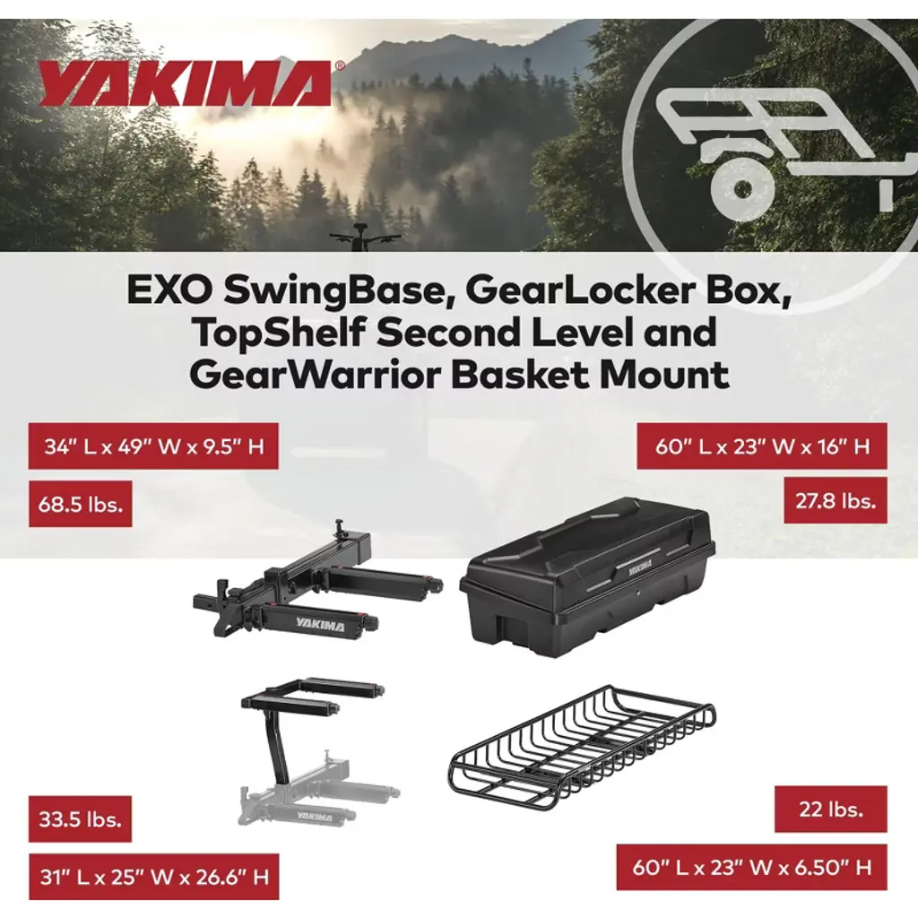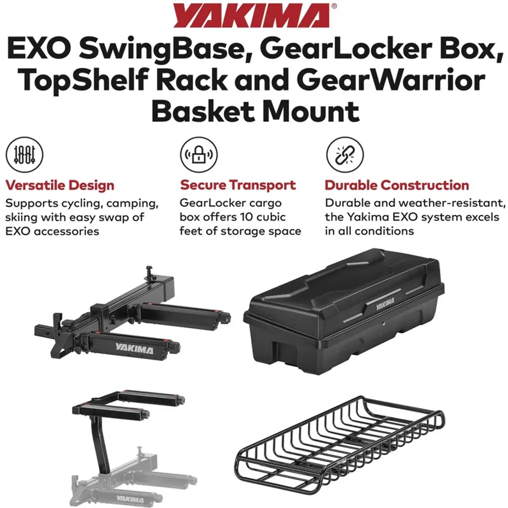 Yakima Exo Swingbase Hitch Rack Bundled With Exo Gearlocker Rooftop Box, Exo Topshelf Hitch Base Rack Storage, And Exo Gearwarrior Basket Mount, Black