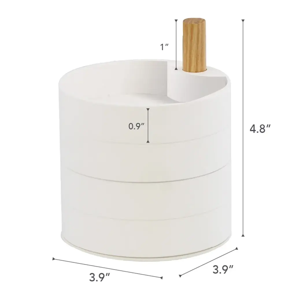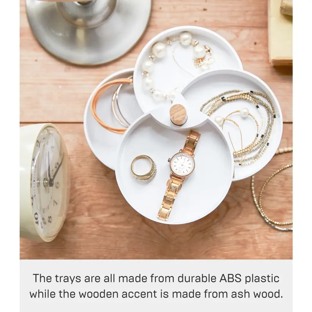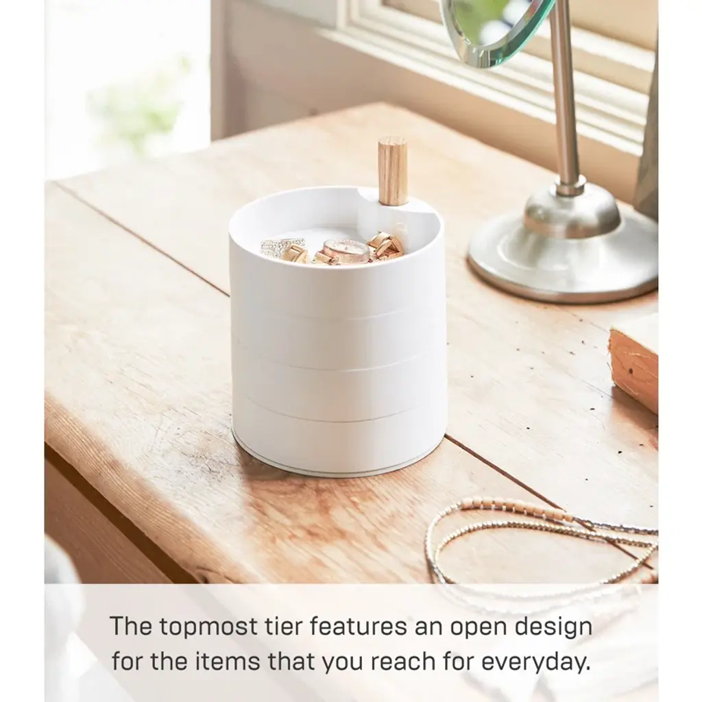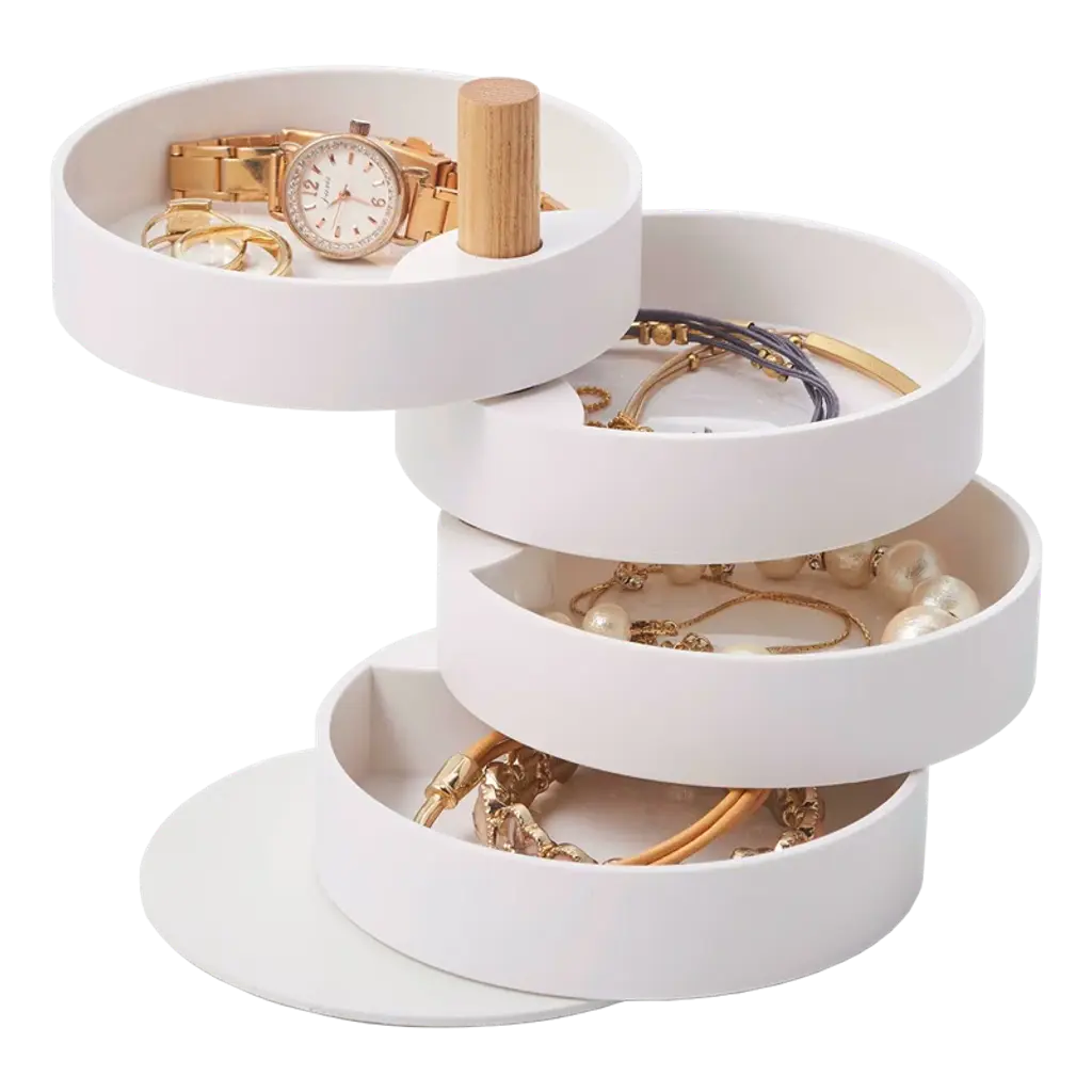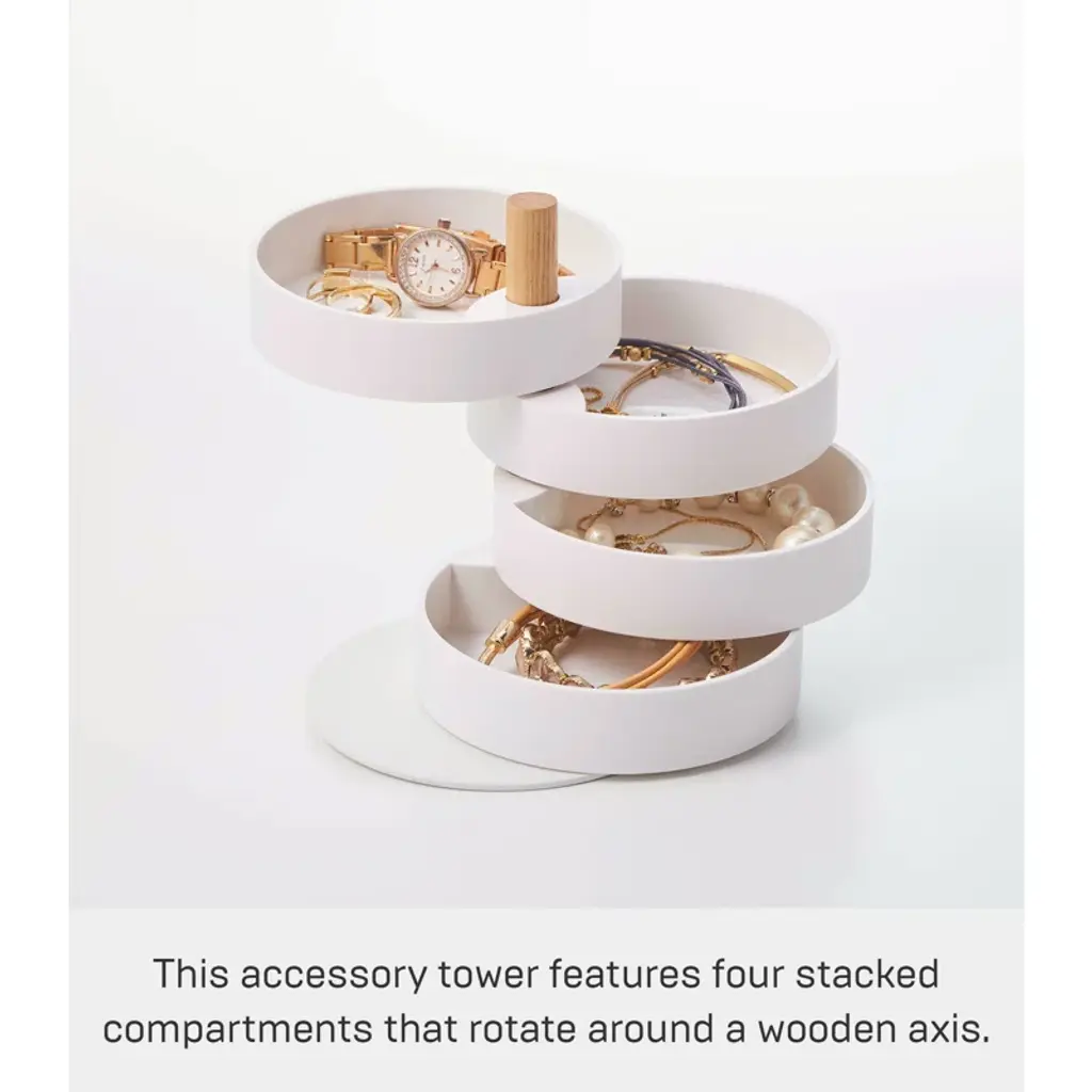 This simple accessory tower features stacked compartments that rotate around a wooden axis, keeping the jewelry organizer's contents tidy and protected.