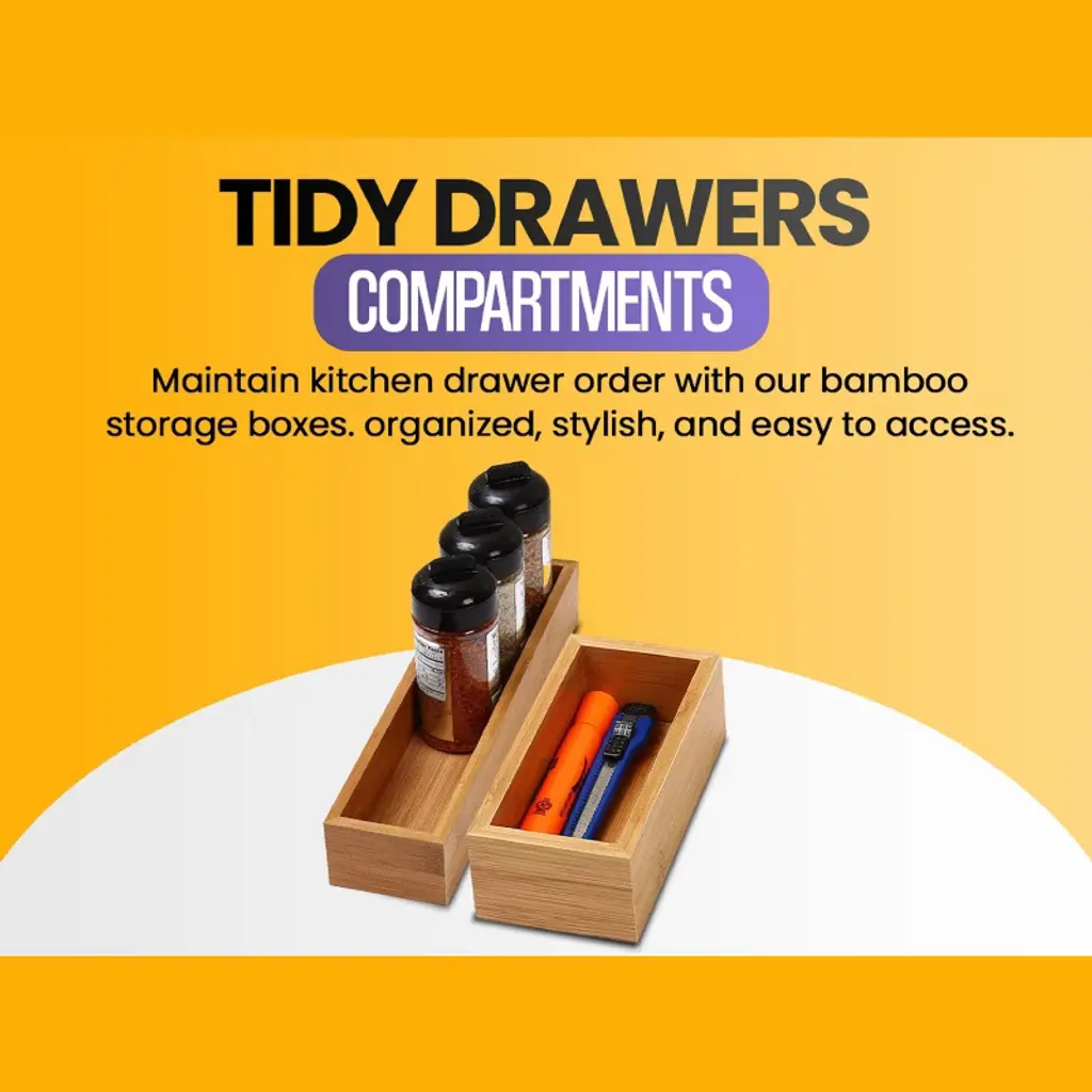 "Tackle the never-ending clutter in your office desk and kitchen drawer with this attractive bamboo storage box organizer Add a Natural Touch to Your Home Organization This environmentally friendly bamboo drawer organizer box is attractive and functional to meet your drawer organization necessities. Made of high quality Moso bamboo, this drawer organizer box is sturdy and versatile to organize various small items inside the drawers around your house. It is perfect to use in your office desk drawer to keep pencils, scissors, paper clips, and erasers organized. Try it in your kitchen drawers to organize spoons, knives, forks, serving utensils, wine stoppers, corn holders, and other kitchen gadgets, or in your bathroom vanity drawers to keep makeup brushes, lipsticks, eye pencils, contour palettes, cream bottles, lip pencils, and jewelry like rings and necklaces neat and tidy. Crafters will also find this useful for organizing their crafting supplies, paint brushes, and scrap booking supplies."