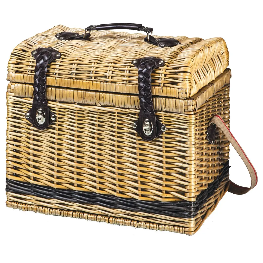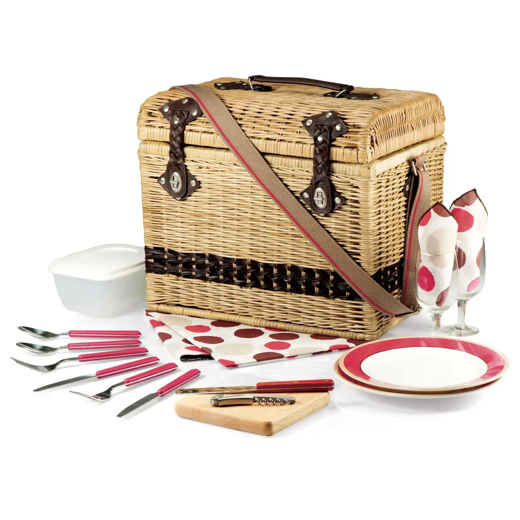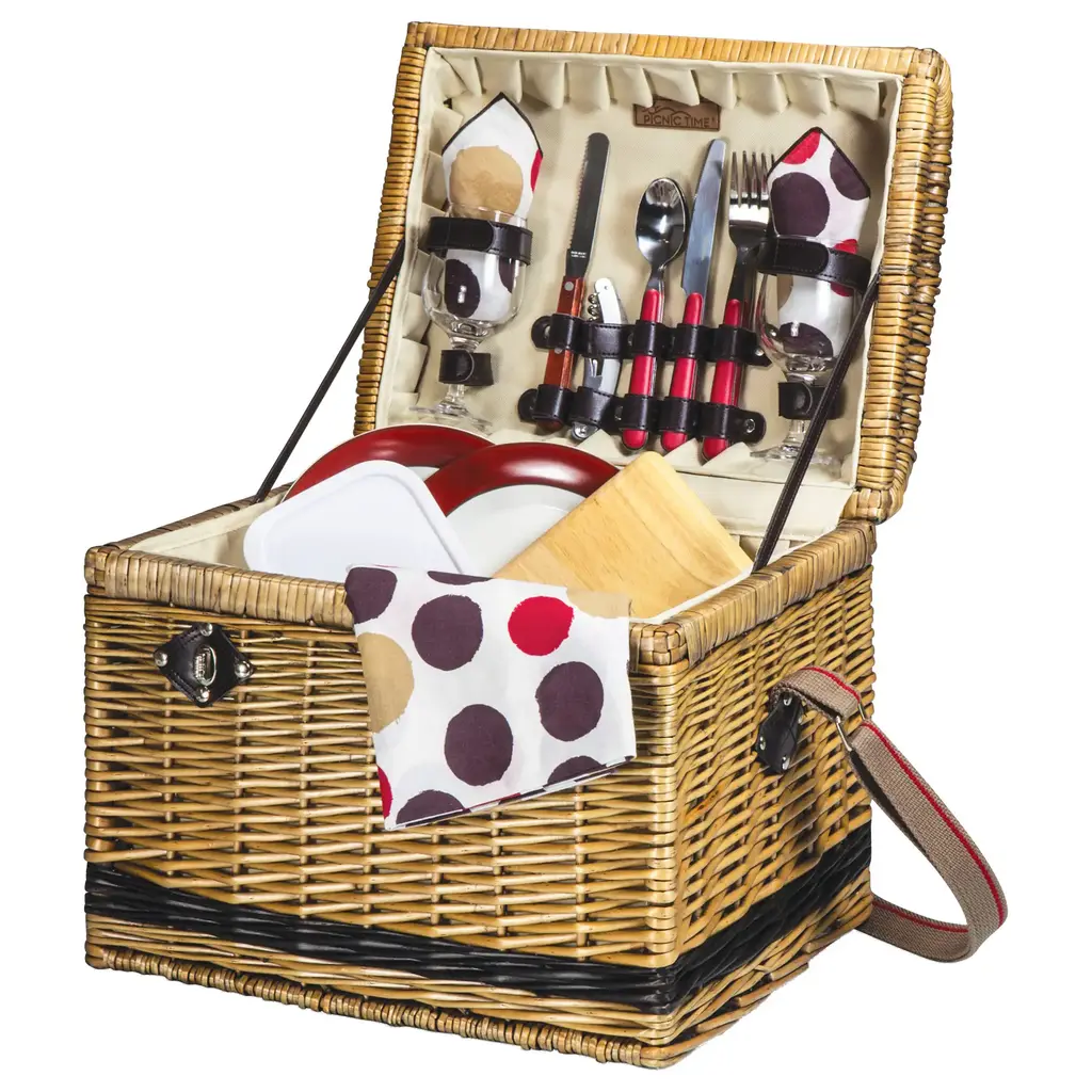 Pack a lunch using this Yellowstone picnic basket set, and enjoy a hassle-free meal in the fresh outdoor air. Complete with service for two, this set includes plates, utensils, and more to give you a leg up on the packing. This picnic basket is handmade with dark willow and features premium leatherette accents for a chic and elegant look.Provides service for twoHandmade of dark willow with premium leatherette accentsFully-lined with beige polyester1.06 cubic feet capacitySurface wash with damp cloth only15 inches x 10 inches x 13 inchesTwo 8-inch porcelain platesTwo stainless steel forks, knives, and spoonsTwo hand-blown wine glassesTwo 14-inch 100-percent cotton napkinsOne plastic food storage containerOne 44-inch square 100-percent cotton tableclothOne stainless steel waiter-style corkscrewOne 6-inch square hardwood cutting boardOne stainless steel cheese knife with wooden handle