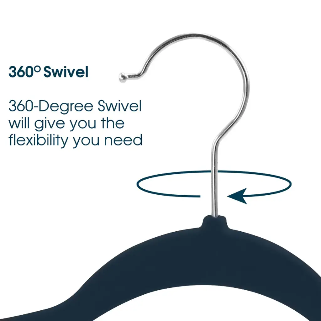 The Elama Home blue flocked velvet hangers are durable and sturdy, designed to hold large and heavy pieces of clothing. It's stronger and much more lighter than wooden hangers, but much sturdier to hold heavier and bulkier clothes without bending. These hangers are a great choice for suits, coats, skirts, shorts dresses, sweater, pants, belts, ties, shawls, thin strap shirts, tanks and women undergarments, camisoles and all your winter clothes. The Elama Home flocked velvet hangers feature a non slip and supreme soft luxurious velvet feel instead of plastic or metal. It holds clothes without falling or sagging and leaving your clothes crease and wrinkle free. The contour shoulders prevents widening of the neck and clothes from slipping off the gentle yet firm non-slip surface hanger. Flocking also does not shed or fade onto your clothes, leaving your clothes looking as fabulous as the day you hung them. Why do our hooks swivel? Because each Elama Home flocked velvet hanger has a nut at the bottom of the hook so they can rotate 360 degrees by a simple twist without drop out. The designed swivel hooks enable you to sort through your clothes easily no matter which direction they hang. The swivel hooks are securely attached to the clothes hangers, so you can hang heavy clothes and the hooks will not snap off or break. The Elama Home Flocked Velvet hanger have a 0.2" thickness, making these velvet hangers slim and sleek while you double maximize and organize your closet space.