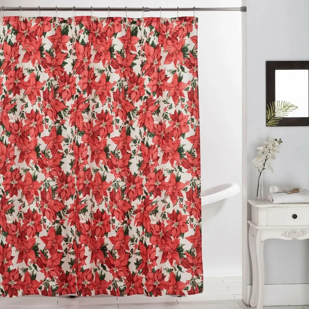 13 Pc Christmas Shower Curtain Set With Metal Roller Hooks Dobby Printed Holiday Bathoom Décor - Joyful Poinsettia