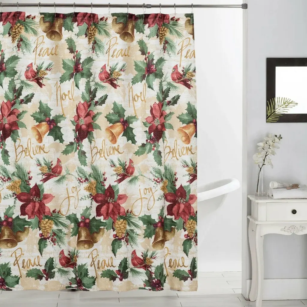 13 Pc Christmas Shower Curtain Set With Metal Roller Hooks Dobby Printed Holiday Bathoom Décor - Poinsettia Holly