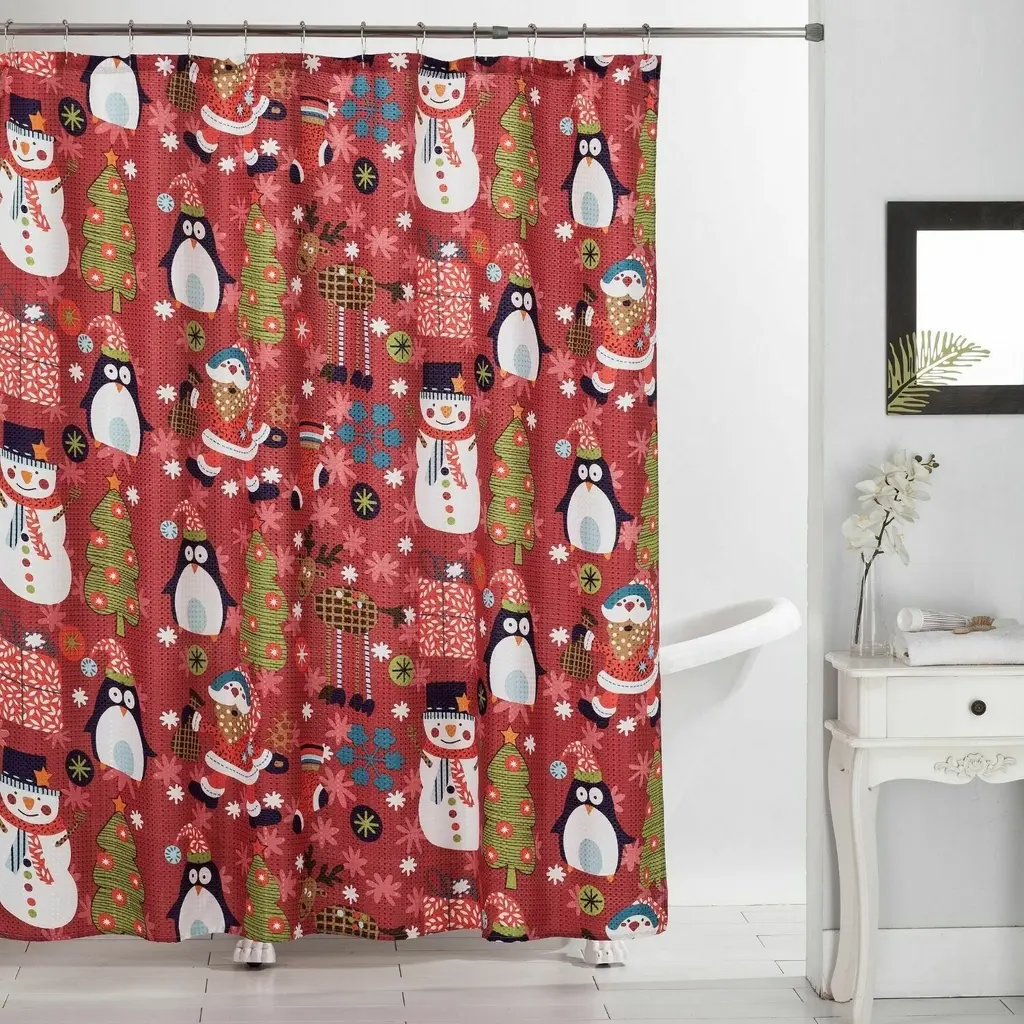 Complete your Holiday decorations with holiday dobby printed shower curtain with hooks by Kashi Home. This bathroom shower curtain set will make your bathroom festive for Holiday Christmas. Shower curtain features beautiful holiday theme on microfiber fabric. Set includes 1 shower curtain and 12 hooks. Shower hooks are made of metal with roller balls for easy glide. Choose from 7 holiday designs. Shower curtain size is 70 inch x 70 inch Care Instructions : Machine wash cold. Do not beach. Hang to dry. Low temperature iron if needed. Celebrate the holiday season in style with the 13 PC Christmas Shower Curtain Set. This all-in-one holiday bathroom decor set is designed to bring festive cheer to your bathroom. Featuring a dobby printed shower curtain and metal roller hooks, it's the perfect addition to make your bathroom feel warm and welcoming during the holiday season. Transform your bathroom into a Christmas wonderland effortlessly. Features: Complete Holiday Set: This 13-piece set includes a dobby printed shower curtain and metal roller hooks for a hassle-free holiday bathroom makeover. Festive Dobby Print: The dobby print showcases classic holiday symbols and patterns, setting the mood for Christmas. Metal Roller Hooks: High-quality metal roller hooks ensure easy installation and durability. Generous Size: The shower curtain measures ample dimensions to fit most standard showers. Quick and Easy Setup: Installation is a breeze with the included metal roller hooks. Holiday Cheer: Create a warm and inviting holiday atmosphere in your bathroom with this decor set. Complete Holiday Transformation: Enjoy an all-in-one set with a dobby printed shower curtain and durable metal roller hooks. Classic Holiday Print: The dobby print features timeless holiday symbols and patterns for a festive mood. Durable Metal Hooks: High-quality metal roller hooks ensure easy installation and lasting performance. Ample Size: The shower curtain provides ample coverage for most standard showers. Warm and Inviting: Bring the warmth and cheer of the holidays into your bathroom with this decor set.