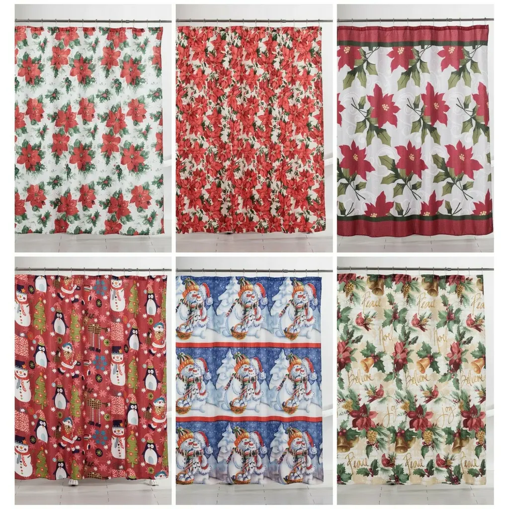 Complete your Holiday decorations with holiday dobby printed shower curtain with hooks by Kashi Home. This bathroom shower curtain set will make your bathroom festive for Holiday Christmas. Shower curtain features beautiful holiday theme on microfiber fabric. Set includes 1 shower curtain and 12 hooks. Shower hooks are made of metal with roller balls for easy glide. Choose from 7 holiday designs. Shower curtain size is 70 inch x 70 inch Care Instructions : Machine wash cold. Do not beach. Hang to dry. Low temperature iron if needed. Celebrate the holiday season in style with the 13 PC Christmas Shower Curtain Set. This all-in-one holiday bathroom decor set is designed to bring festive cheer to your bathroom. Featuring a dobby printed shower curtain and metal roller hooks, it's the perfect addition to make your bathroom feel warm and welcoming during the holiday season. Transform your bathroom into a Christmas wonderland effortlessly. Features: Complete Holiday Set: This 13-piece set includes a dobby printed shower curtain and metal roller hooks for a hassle-free holiday bathroom makeover. Festive Dobby Print: The dobby print showcases classic holiday symbols and patterns, setting the mood for Christmas. Metal Roller Hooks: High-quality metal roller hooks ensure easy installation and durability. Generous Size: The shower curtain measures ample dimensions to fit most standard showers. Quick and Easy Setup: Installation is a breeze with the included metal roller hooks. Holiday Cheer: Create a warm and inviting holiday atmosphere in your bathroom with this decor set. Complete Holiday Transformation: Enjoy an all-in-one set with a dobby printed shower curtain and durable metal roller hooks. Classic Holiday Print: The dobby print features timeless holiday symbols and patterns for a festive mood. Durable Metal Hooks: High-quality metal roller hooks ensure easy installation and lasting performance. Ample Size: The shower curtain provides ample coverage for most standard showers. Warm and Inviting: Bring the warmth and cheer of the holidays into your bathroom with this decor set.