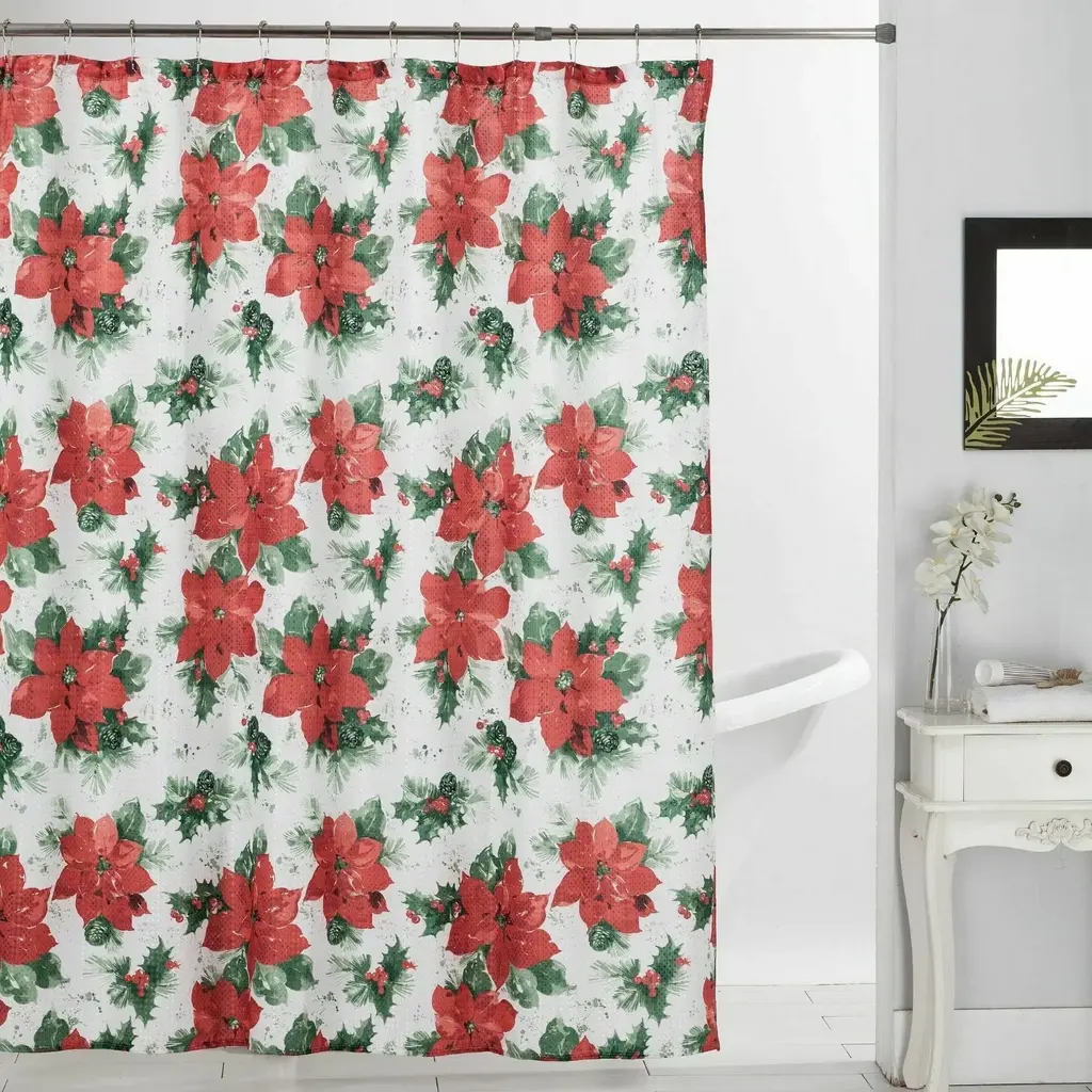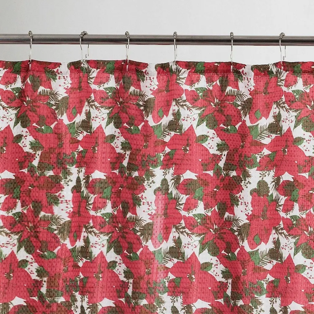 13 Pc Christmas Shower Curtain Set With Metal Roller Hooks Dobby Printed Holiday Bathoom Décor - Red Poinsettia