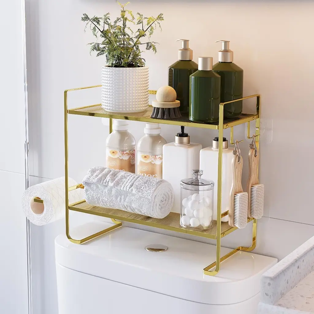 2 Tier Above Toilet Organizers, Large Capacity Over The Toilet Storage Shelf With Paper Holder And 2 Hooks