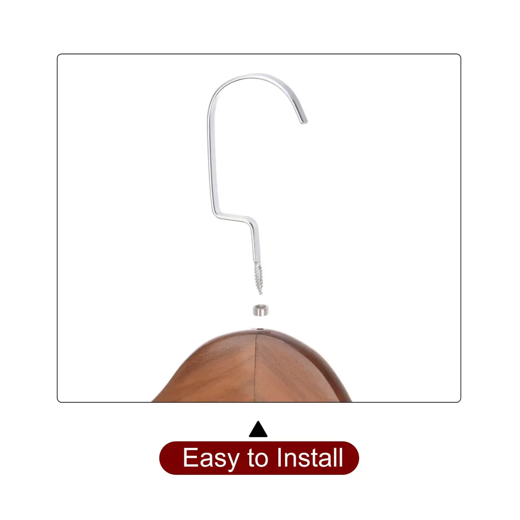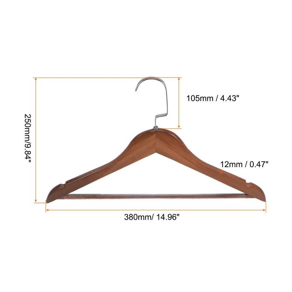 Hook Length: 105mm / 4.43"Main Material: Stainless Steel, WoodenMain Color: Silver Tone, Wood BrownPackage Content: 2 x Wooden Hanger, 2 x Metal Rings1. These clothes hangers are made of retro wood with strength and durability and are sturdy enough to hang heavy clothes. They have been sanded to a smooth, splinter-free finish and coated in clear lacquer for added protection and to bring out the natural wood grain. The hook is made of stainless steel with a chrome-plated surface, which is not easy to rust.2. The retro hanger with curved shoulders helps your coat or suit hold its shape while hanging neatly in your bedroom closet.Two notches on both sides shoulders can keep your clothes in one place without slipping.3. Each hanger maximizes your closet's storage space. The contoured shoulders keep your clothes wrinkle-free and make your closet look nice.4. Retro wooden suit hanger is suitable for hanging tank top, dresses, jackets, pants, shirts, hats, belts, skirts, coats and more.