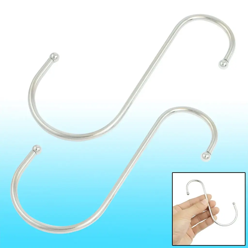 Product Name : S Hook;Material : MetalColor : Silver ToneSize(Each) : 11.5 x 6.5 x 0.35cm / 4.5" x 2.7" x 0.15"(L*W*D)Net Weight : 39gPackage Content : 2 x S Shaped Hook The S Shaped Hooks is useful as it provides a small ridge to stop something hanging from falling off the hook with the ball end design. It is suitable to hanging clothes, paint tins or baskets, etc.