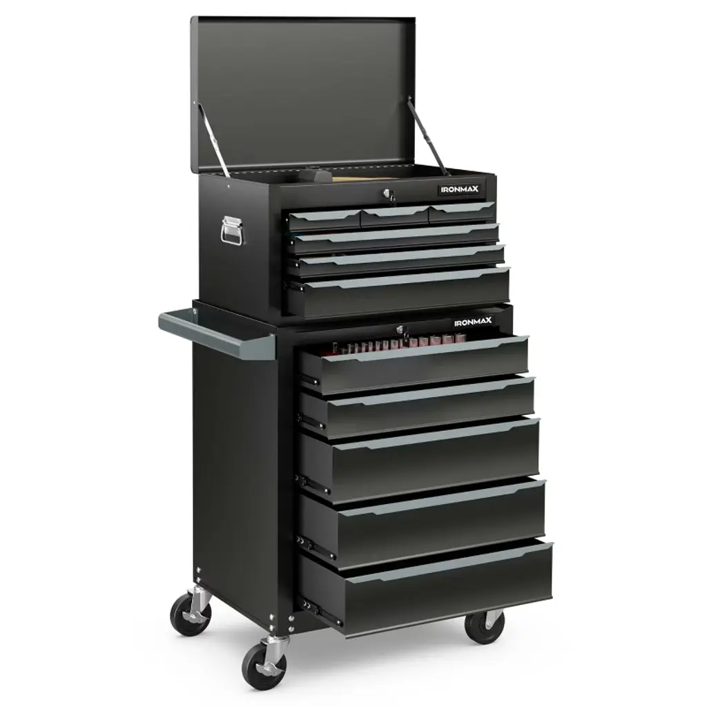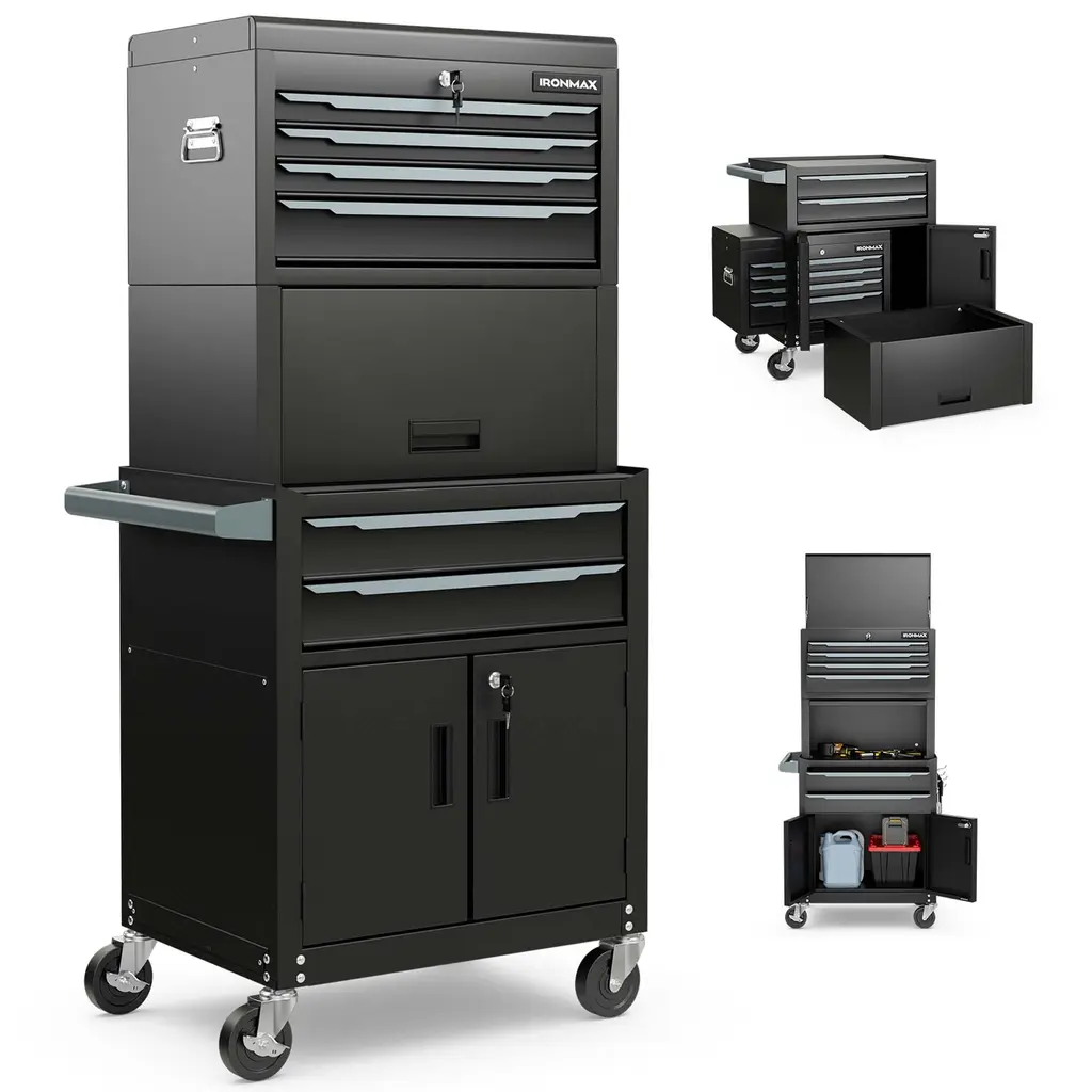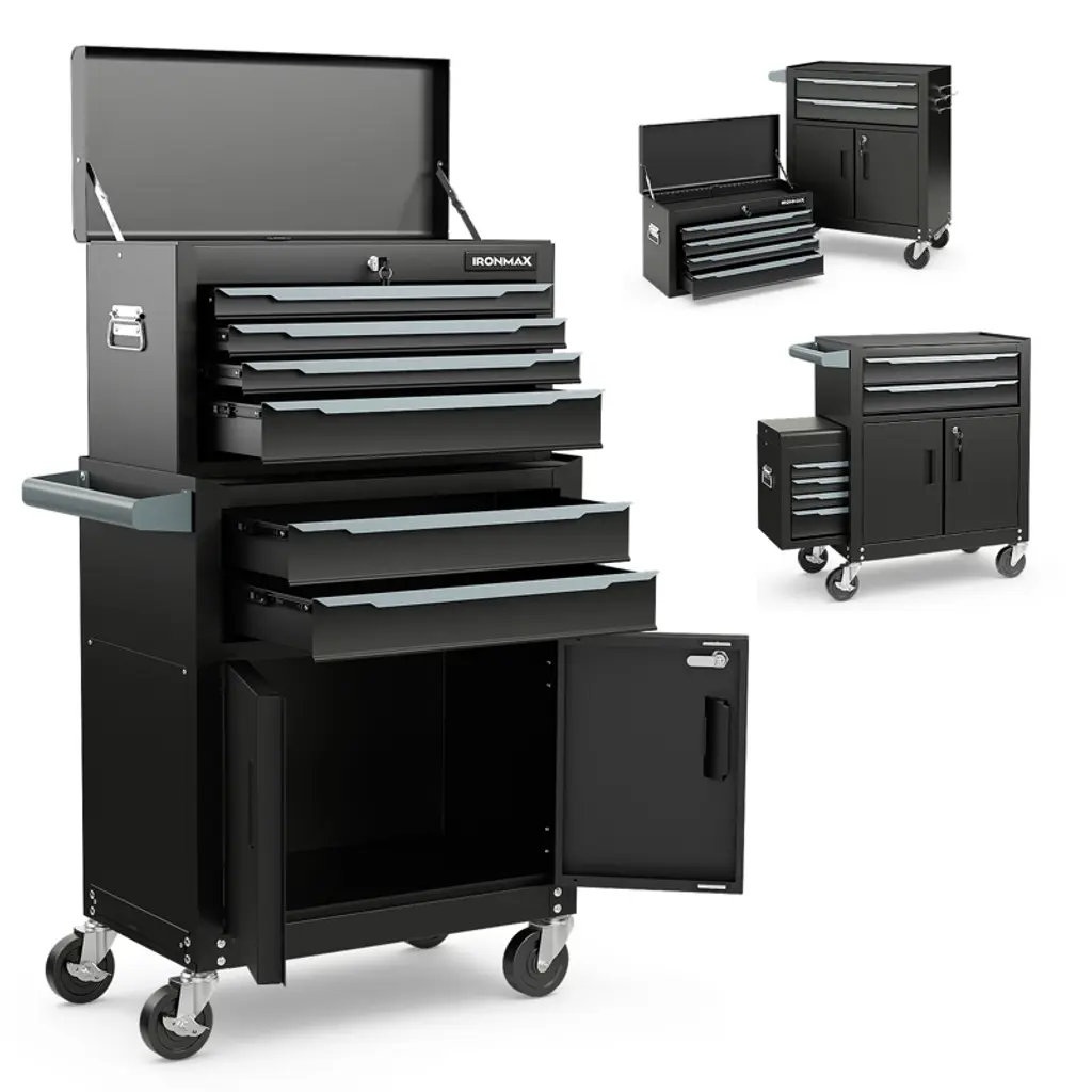 SpecificationsKey Features:● Upgraded Design: With 24" cabinet width and an additional 9.5" high cabinet, this tool storage cabinet is much taller and offers more storage space. And it features larger wheels with 4" diameter and convenient handle which is thicker and more heavy-duty, thus more comfortable to grip. Overall dimension: 28" x 13" x 53" (L x W x H).● 3-in-1 Tool Chest: This rolling tool box organizer consists of 3 pieces, which can be flexibly combined as you need. And you can detach the upper chest and put it into the bottom cabinet for saving space.● Automatic Locking Design: The drawers of top chest can be opened when the cover is lifted. Such an automatic locking system ensures high-level security. And the upper and lower locks respectively come with 2 corresponding keys. Plus, the premium ball bearing drawer slides are designed for smooth opening and closing.● Robust Metal Structure: The whole tool chest combo is mainly made of high-grade metal which is super sturdy and rustproof. Therefore, it can withstand long-time use and heavy weight up to 330 lbs.● Versatile Applicable Occasions: The tool chest comes with four 360° swiveling wheels, 2 of which are lockable, ensuring simple movement. And it will highly improve your working efficiency in auto repair shop, tool room, garage, warehouse and so on.
