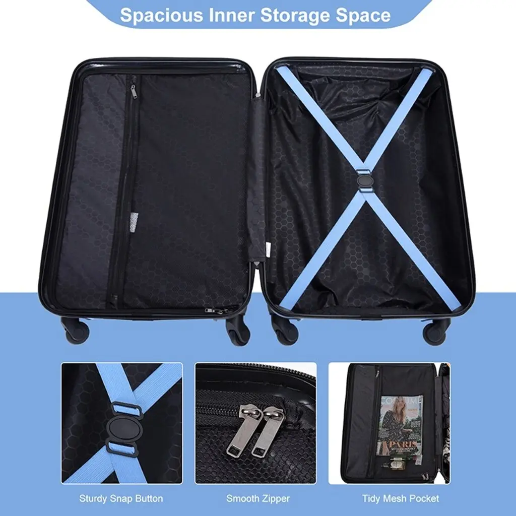 Each suitcase includes a TSA-approved lock for enhanced security, smooth 360° spinner wheels for effortless movement, and a multi-stage telescoping handle. Inside, you’ll find a spacious and organized interior with snap-straps and a mesh pocket for essentials. The 28” suitcase even comes with two hooks for hanging bags or accessories.Features:Quick Glance Points: