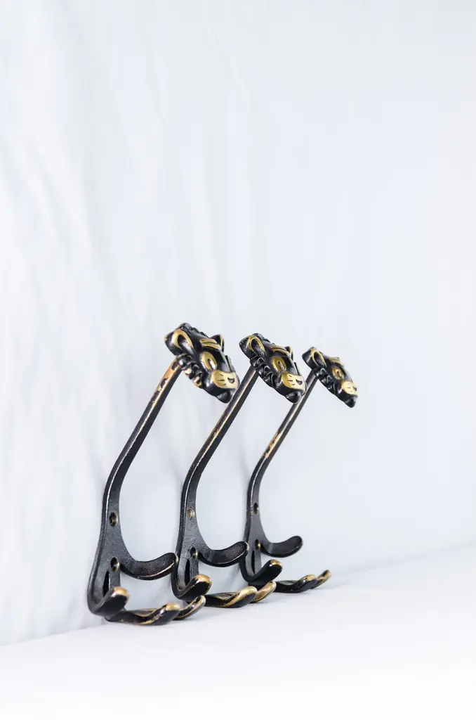 3 Walter Bosse Brass Wall Hooks Of A Lion Austria, 1950s