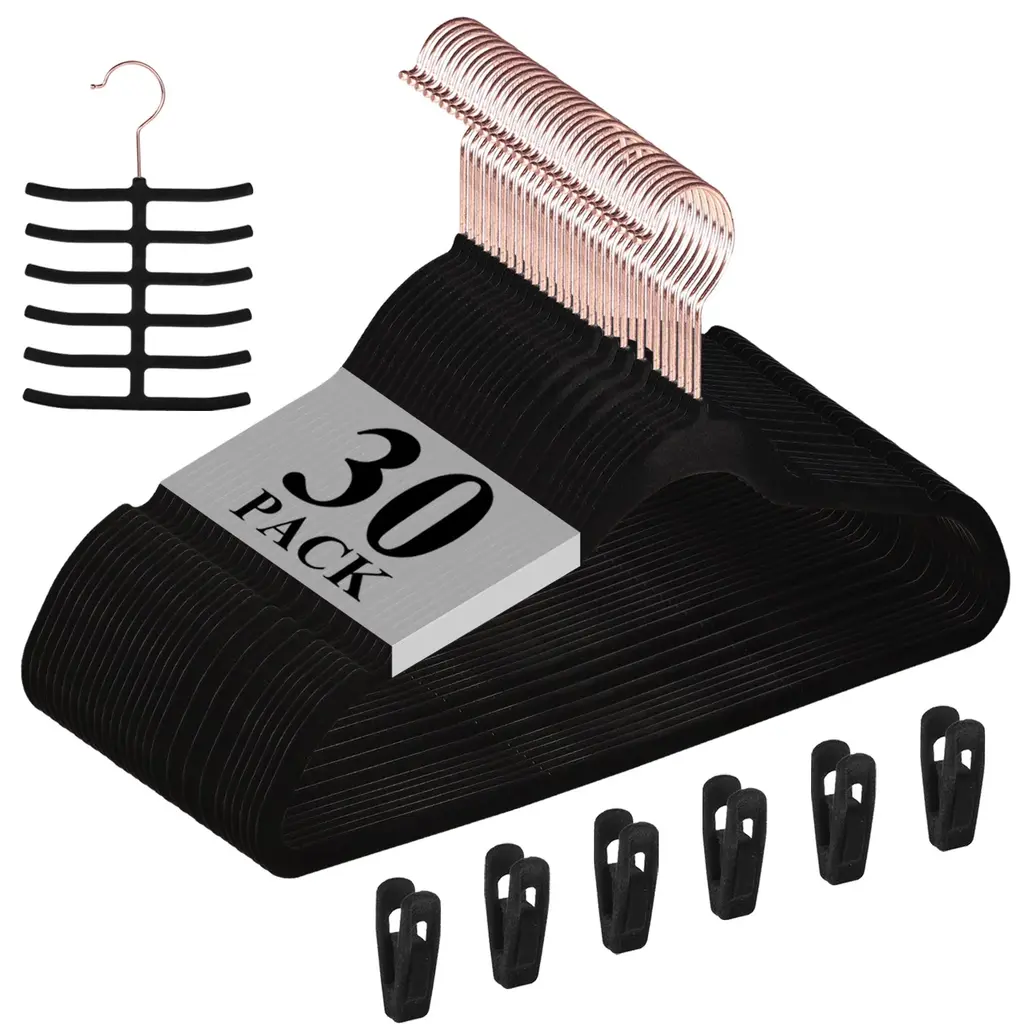 Specification:Description:Maximize closet space and keep your wardrobe neatly organized with this 30-pack of black clothes hangers made from a durable blend of plastic and rubber. Each hanger features a stainless steel hook with 360-degree swivel functionality, making it easy to access garments from any angle. Designed for both functionality and versatility, the hangers include notched shoulders to securely hold strappy tops and dresses, ridged non-slip edges to prevent silky fabrics from sliding off, and a hang tab that helps keep thin straps or accessories in place. The bottom textured bar provides a secure grip for pants and slacks, while the small hanging pole is perfect for storing ties or scarves. Lightweight yet sturdy, this set is ideal for maintaining a tidy, well-organized closet.Key Features: