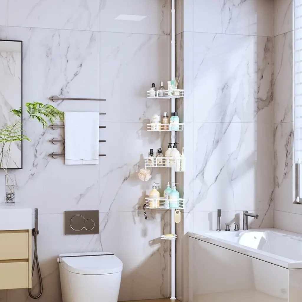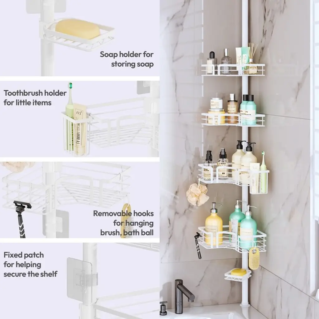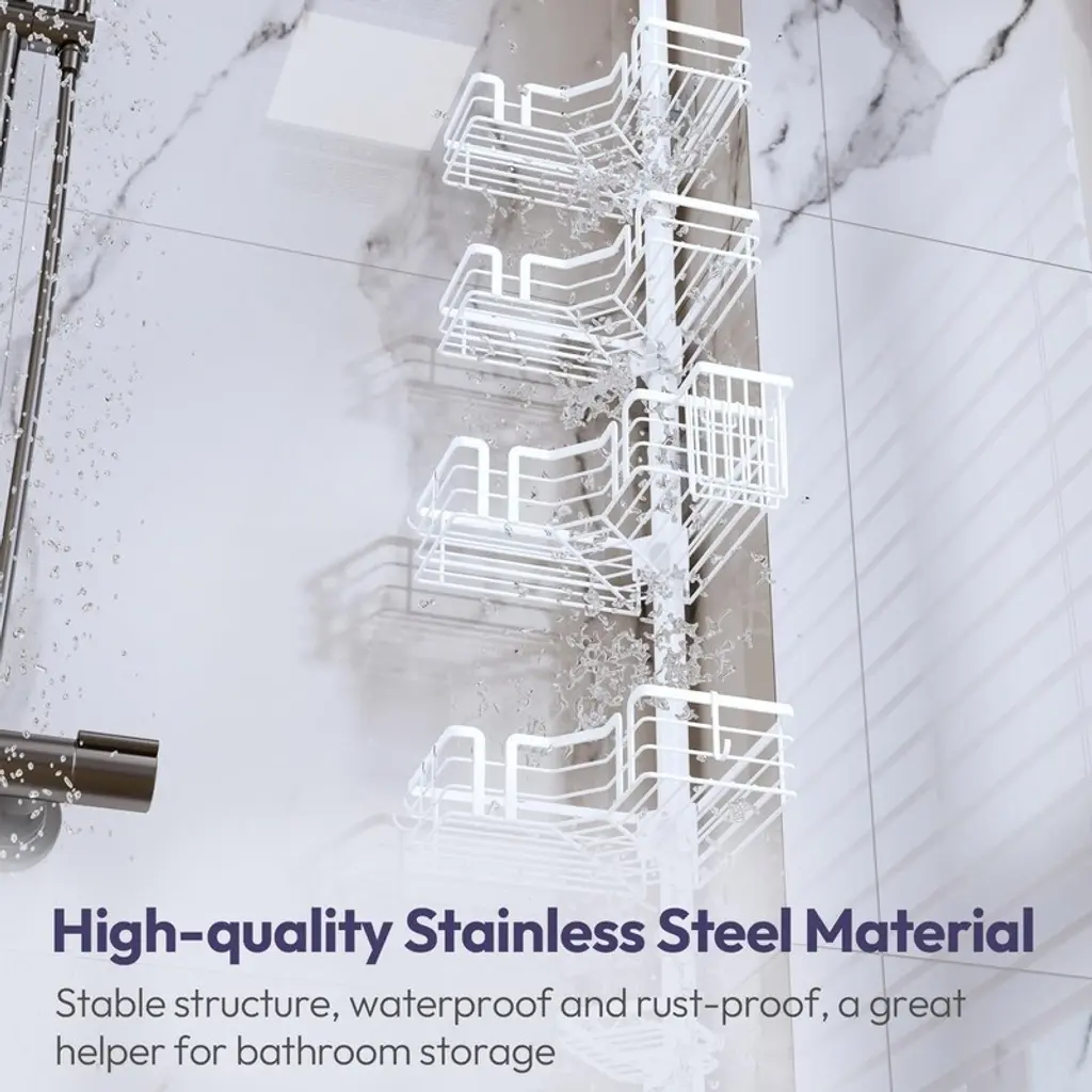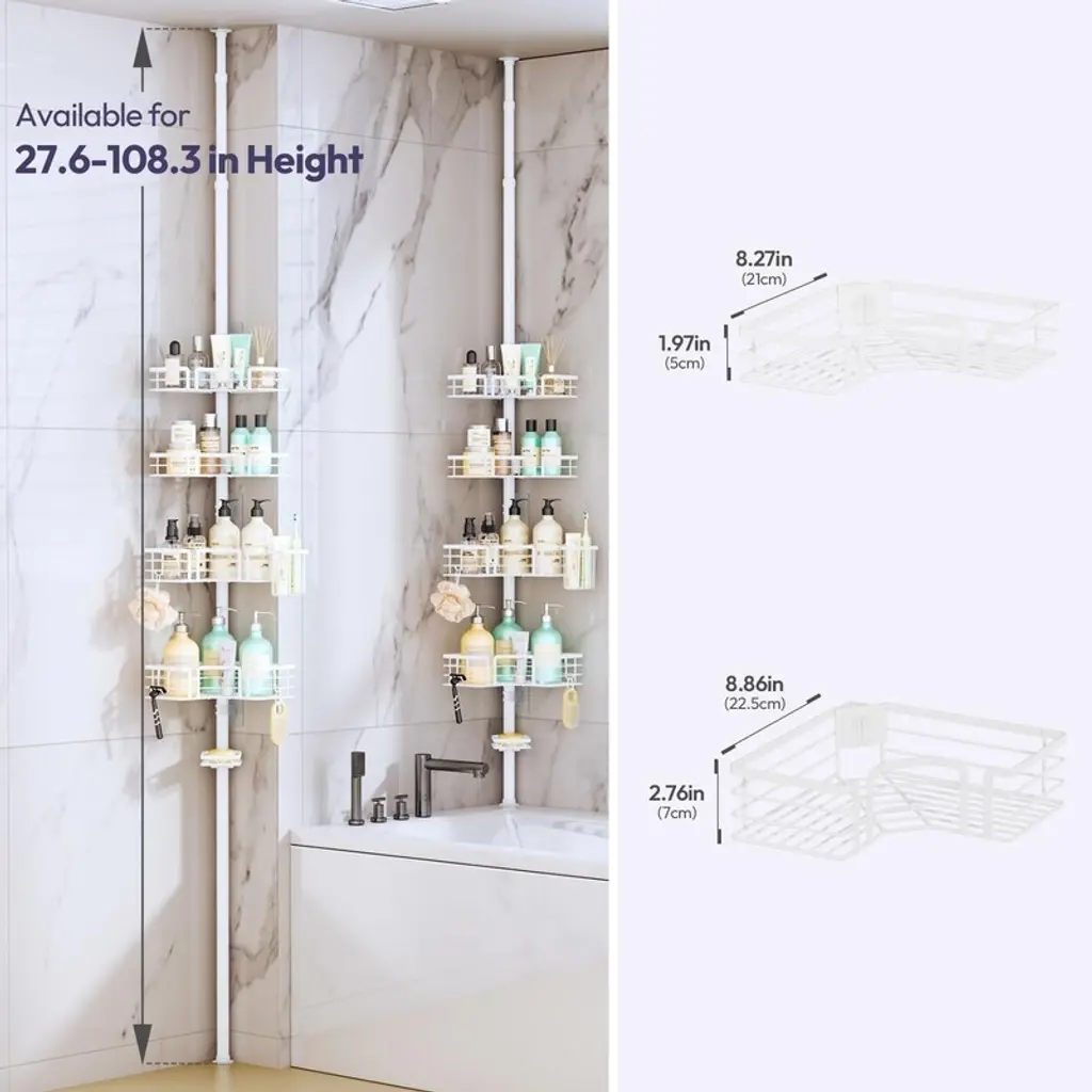 The corner shower caddy has an adjustable tension pole that can extend from 27.6 to 108.3 inches, fitting most bathrooms securely and stably.Equipped with a soap holder and toothbrush rack, these corner shower shelves offer extra space for small items, helping to keep your bathroom organized.Users can adjust the positions of the baskets on the standing tension pole shower caddy to accommodate various bottle sizes, providing family - friendly convenience and optimizing storage.Constructed from 304 stainless steel, this tension rod shower organizer is highly durable and resistant to rust and corrosion, making it ideal for humid bathroom conditions.Each basket of the tension rod shower shelves features a hollow mesh structure, enabling fast water drainage to keep toiletries dry, hygienic, and reducing mold and mildew risks.This floor - to - ceiling shower caddy allows for quick and easy setup without drilling. The standing shower organizer stays firmly in place, offering reliable storage.
