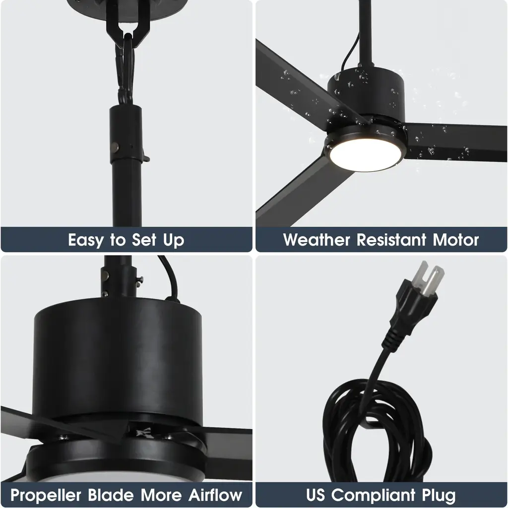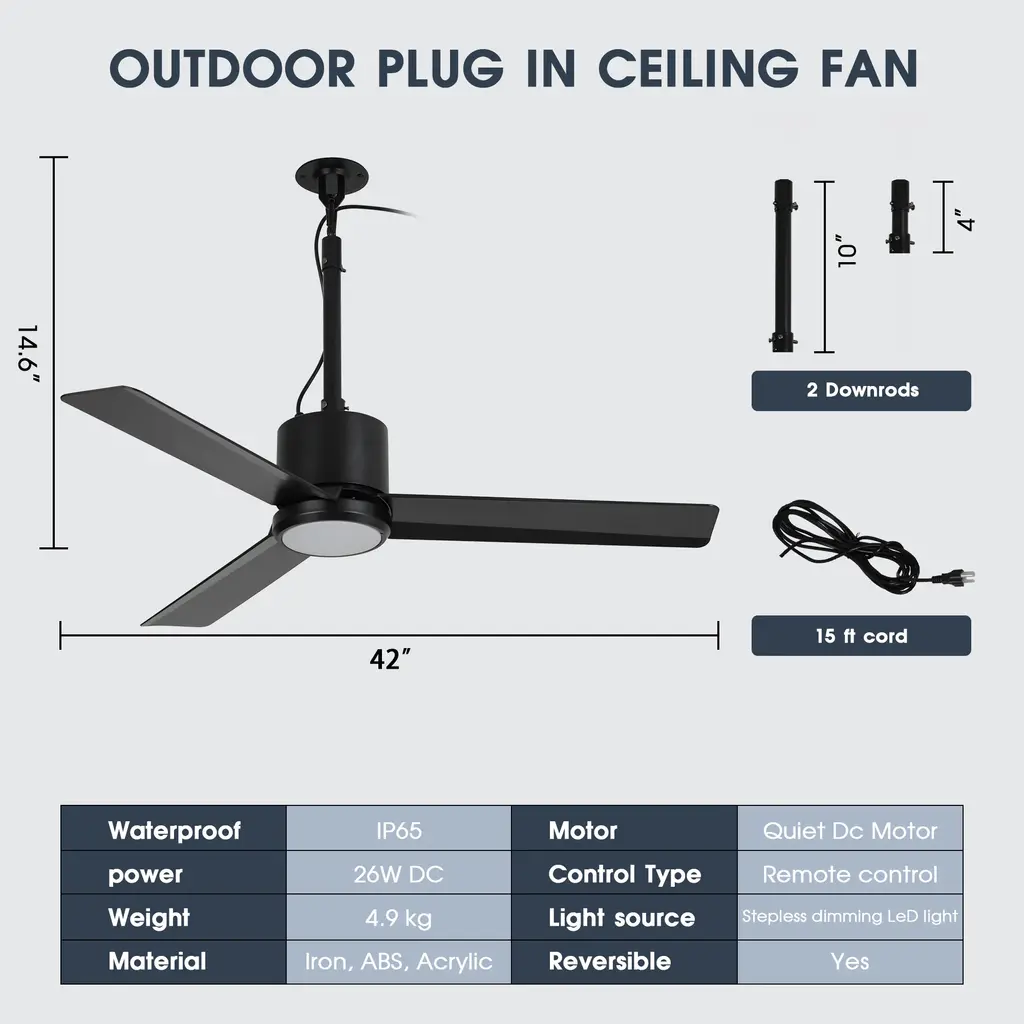 This 42-inch Outdoor DC Motor Black Modern Hanging Buckle Downrod Ceiling Fan with LED Light is an excellent investment for those who want to enhance the comfort and style of their home. 【Outdoor Ceiling Fans】: Made with durability in mind, this ceiling fan can withstand a variety of weather conditions, making it a great addition to patios, decks, and other outdoor areas. This fan can be used in the rain outdoors, but cannot be put into water.【Classic Design】: This 42-inch ceiling fan features a modern black design with a DC motor for excellent durability and stability.【Unique Installation】: The fan is designed with a hook-down rod for easy installation and can be securely hung on the ceiling to ensure safe use.【Energy-saving Lighting】: The ceiling fan is equipped with LED lights, which not only provide comfortable airflow but also serve as an indoor lighting fixture with adjustable brightness.【High-quality Motor】: The fan is driven by an efficient DC motor, which runs smoothly and has low noise, providing long-lasting and comfortable air circulation, energy-saving, and environmentally friendly.