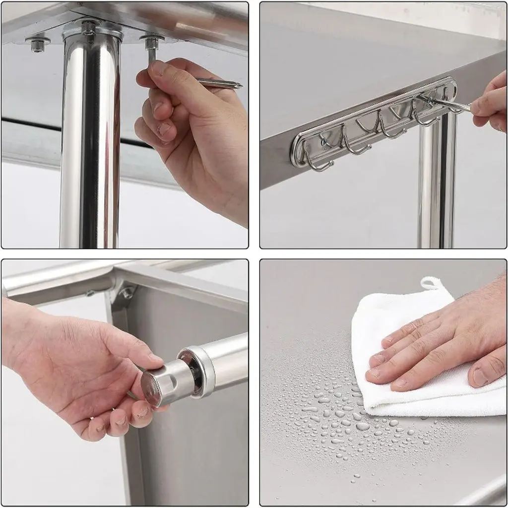 Introducing the 48"x24" Stainless Steel Table, a versatile and durable prep table designed to meet the demands of any professional or home workspace. Crafted from high-quality stainless steel, this workbench offers exceptional strength and resistance to rust and corrosion, making it perfect for kitchens, garages, workshops, bars, restaurants, laundry rooms, schools, hospitals, and warehouses. This stainless steel workbench features a spacious 48"x24" surface with an arc corner edge for added safety and comfort during use. The built-in backsplash prevents spills and debris from falling behind the table, keeping your workspace clean and organized. Equipped with sturdy three-layer metal shelves, it provides ample storage space for tools, ingredients, or supplies, helping you maintain an efficient and clutter-free environment. Designed for convenience, the table includes hooks for hanging utensils or equipment, ensuring everything you need is within easy reach. The four heavy-duty wheels allow for smooth mobility, making it easy to reposition the table wherever you need it most. Whether you need a reliable kitchen workbench, a robust garage or workshop table, or a functional storage solution for your business, this stainless steel prep table is the ideal choice. Key Features: - Durable stainless steel construction for long-lasting use and easy cleaning - Spacious 48"x24" work surface with arc corner edges for safety - Built-in backsplash to keep your workspace tidy - Three-layer metal shelves for ample storage and organization - Convenient hooks for hanging tools and utensils - Four heavy-duty wheels for easy mobility and repositioning Upgrade your workspace with this versatile and sturdy stainless steel workbench. Perfect for professional and home use, it combines practicality, durability, and mobility to help you work smarter and more efficiently.