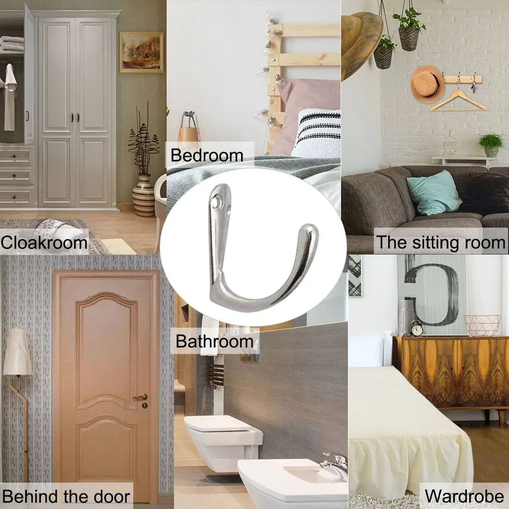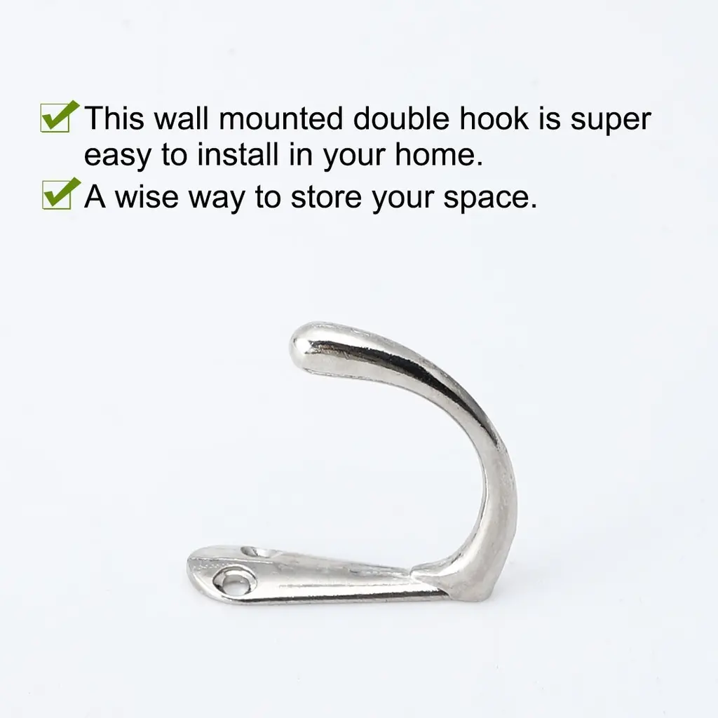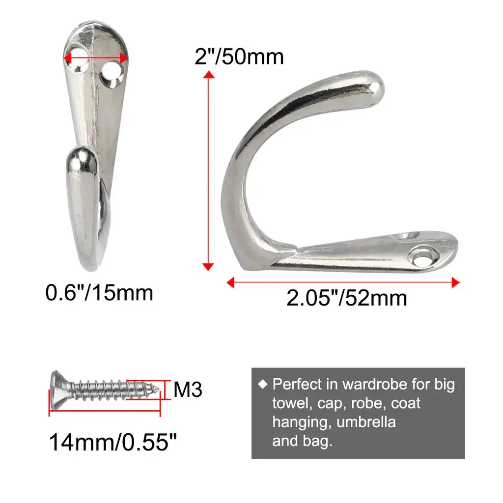 Features:1.High Quality: The wall-mount hooks were made of high-quality zinc alloy materials; rust-resistant and durable, can serve for a longer time.2.Simple Looking & Stylish: Simple and stylish towel hook, unique design appearance is great for additional decoration in your home. Make your home have a sense of design and fashion.3.Well Loading Capacity: The robe hooks can provide a good loading capacity, more durable; Fixed with holes, it becomes solid and powerful and don't worry the carrying falling off.4.Easy Installation: The package includes mounting screws, easy and convenient mounting of this practical coat hook to the wall.5.Easy to Clean: These wall hooks are easy to clean, just wipe it slightly; Can be applied in your bathroom, balcony, bedroom, kitchen, hotel and so on.6.Wide Application: Suitable for holding a wide variety of items, like coats, hats, handbags, umbrellas, towels or robes; A good helper for home storage and organization. Available Quantity: 1pcs, 2pcs, 4pcs, 6pcs, 8pcs, 10pcs Specifications:Product Name: Robe HookMaterial: Zinc AlloyTotal Size: 52 x 15 x 50mm/2.05" x 0.6" x 2"(L*W*H)Mounting Hole Dia: 4mm/0.16"Mounting Hole Center Distance: 8mm/0.32"Opening Width: 38mm/1.5"Screw Size: M3 x 14mm/M3 x 0.55"(D*L)Color: Silver TonePackage Included: 1/2/4/6/8/10 x Robe Hooks, 2/4/8/12/16/20 x Screws Notes:1. Variability of 1-2mm is possible due to the measurement process.2. Due to the shooting and screen setting difference, the color of the item may be slightly different from the pictures.
