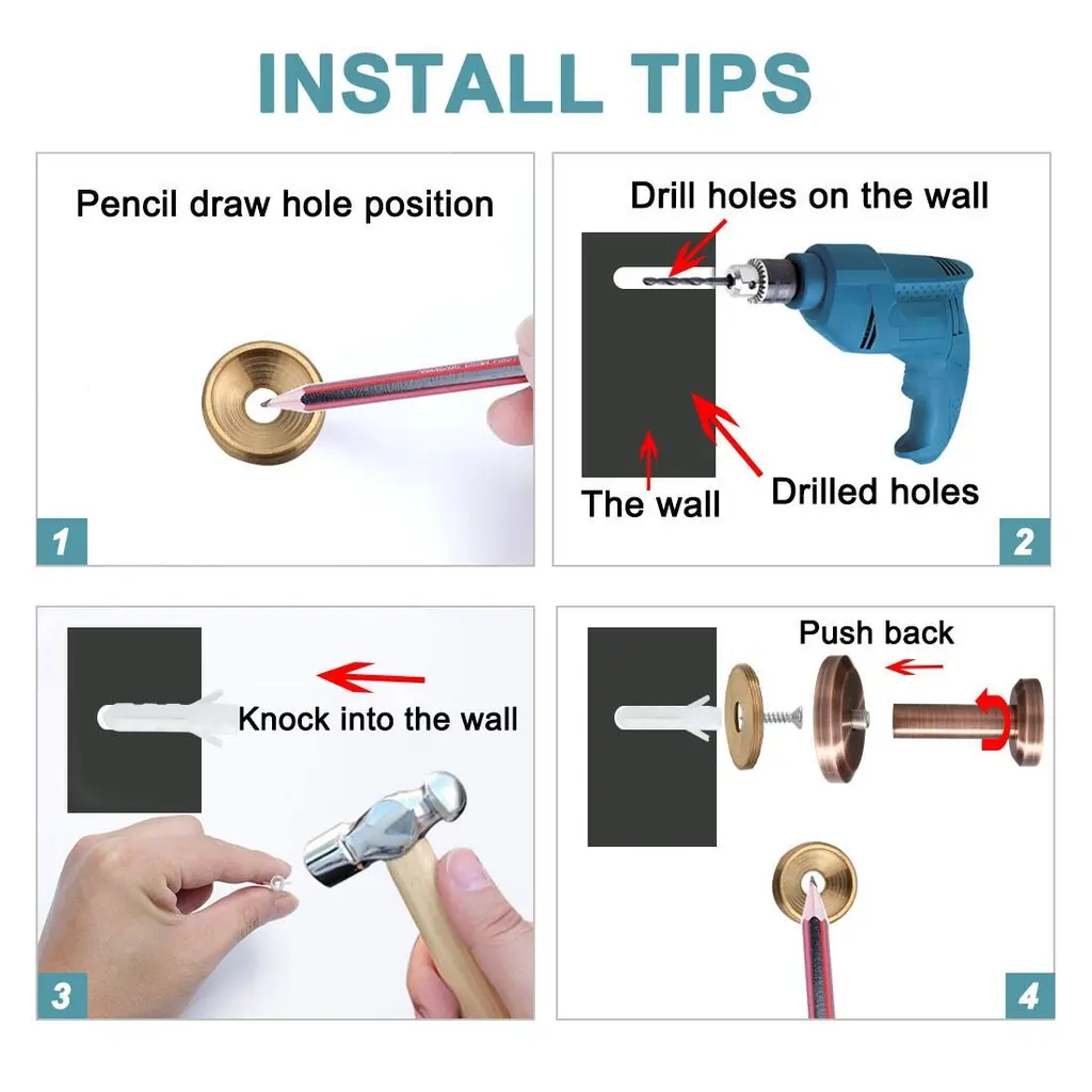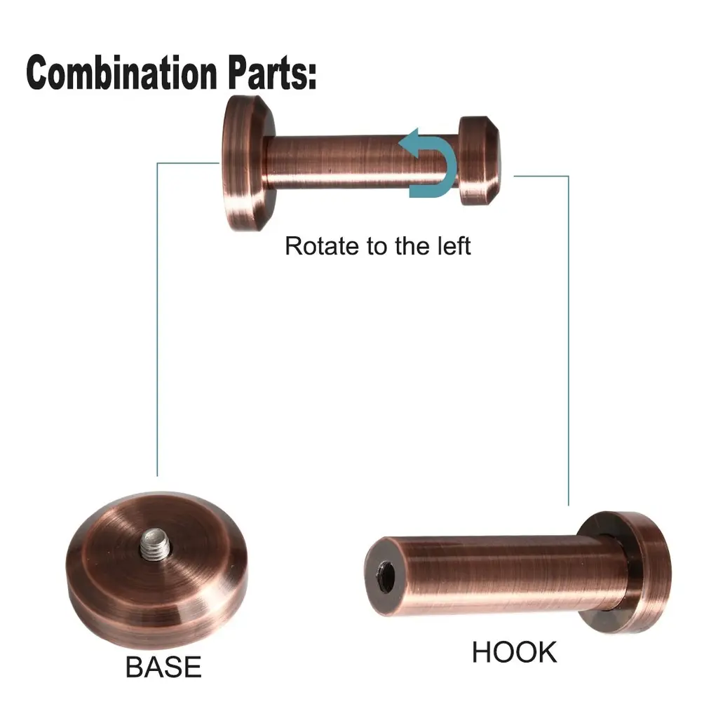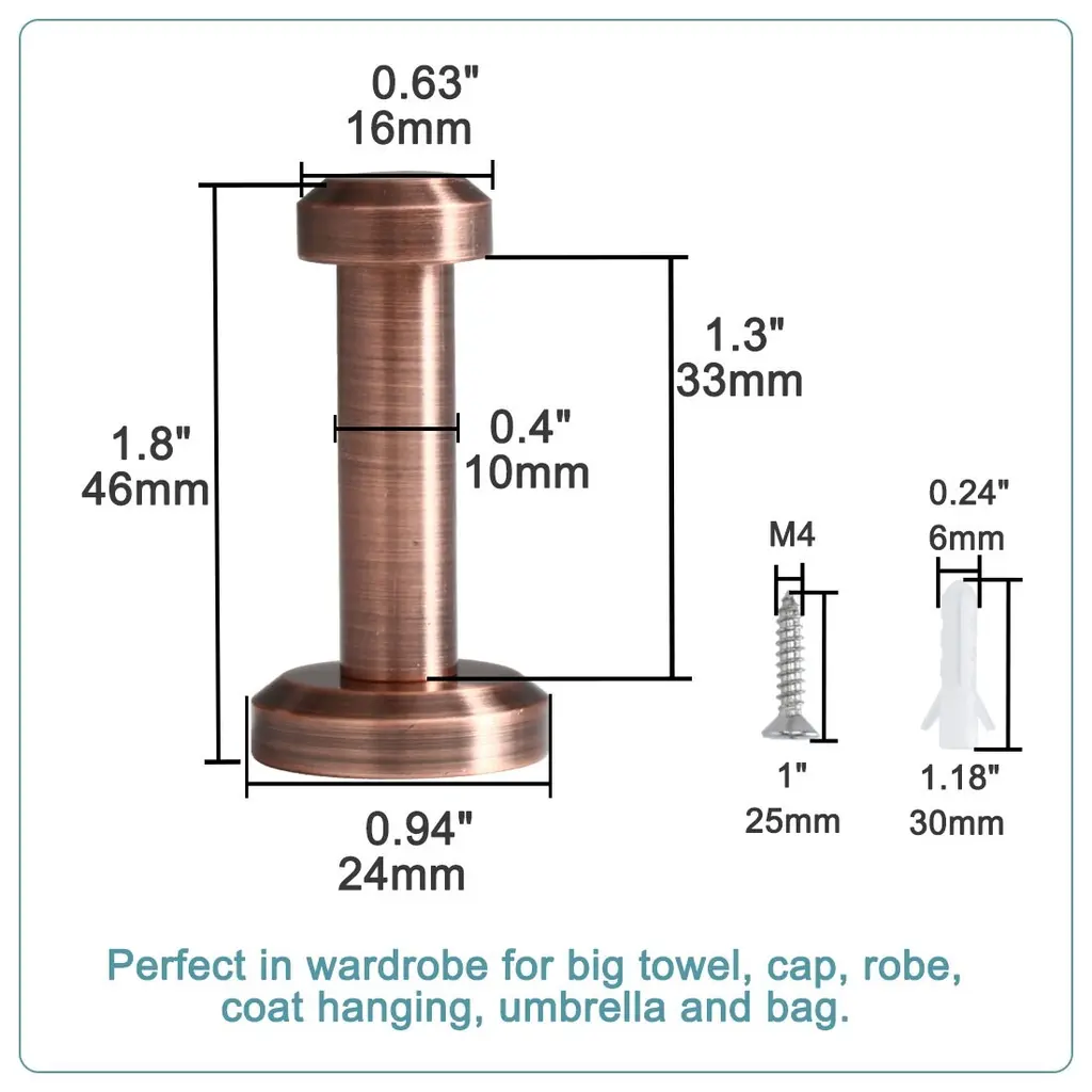1.High Quality: The wall-mount hooks were made of high-quality copper materials; rust-resistant and durable, can serve for a longer time.2.Simple Looking & Stylish: Simple and stylish towel hook, unique design appearance is great for additional decoration in your home. Make your home have a sense of design and fashion.3.Save Space: Provides an abundance of space for hanging items and getting organized. Smooth touching without scratches your hands, closing design can stop items falling, more security than an open side.4.Well Loading Capacity: The robe hooks can provide a good loading capacity, more durable; Fixed with holes, it becomes solid and powerful and don't worry the carrying falling off.5.Easy Installation: The package includes mounting screws, easy and convenient mounting of this practical coat hook to the wall.6.Easy to Clean: These wall hooks are easy to clean, just wipe it slightly; Can be applied in your bathroom, balcony, bedroom, kitchen, hotel and so on.7.Wide Application: Suitable for holding a wide variety of items, like coats, hats, handbags, umbrellas, towels or robes; A good helper for home storage and organization. Available Quantity: 2pcs, 4pcsAvailable Color: Copper Tone, Bronze Tone, Gold Tone, Silver Tone Specifications:Product Name: Wall HookMaterial: CopperTotal Size: 16 x 24 x 46mm/0.63" x 0.94" x 1.8"(Top D*Bottom D*H)Hook Arm Size: 10 x 33/0.4" x 1.3"(D*H)Mounting Hole Dia: 4mm/0.16"Screw Size: M4 x 25mm/M4 x 1"(D*L)Expansion Tube Size: 6 x 30mm/0.24" x 1.18"(D*L)Package Included: 2/4 x Wall Hooks, 2/4 x Screws, 2/4 x Expansion Tubes Notes:1. Variability of 1-2mm is possible due to the measurement process.2. Due to the shooting and screen setting difference, the color of the item may be slightly different from the pictures.