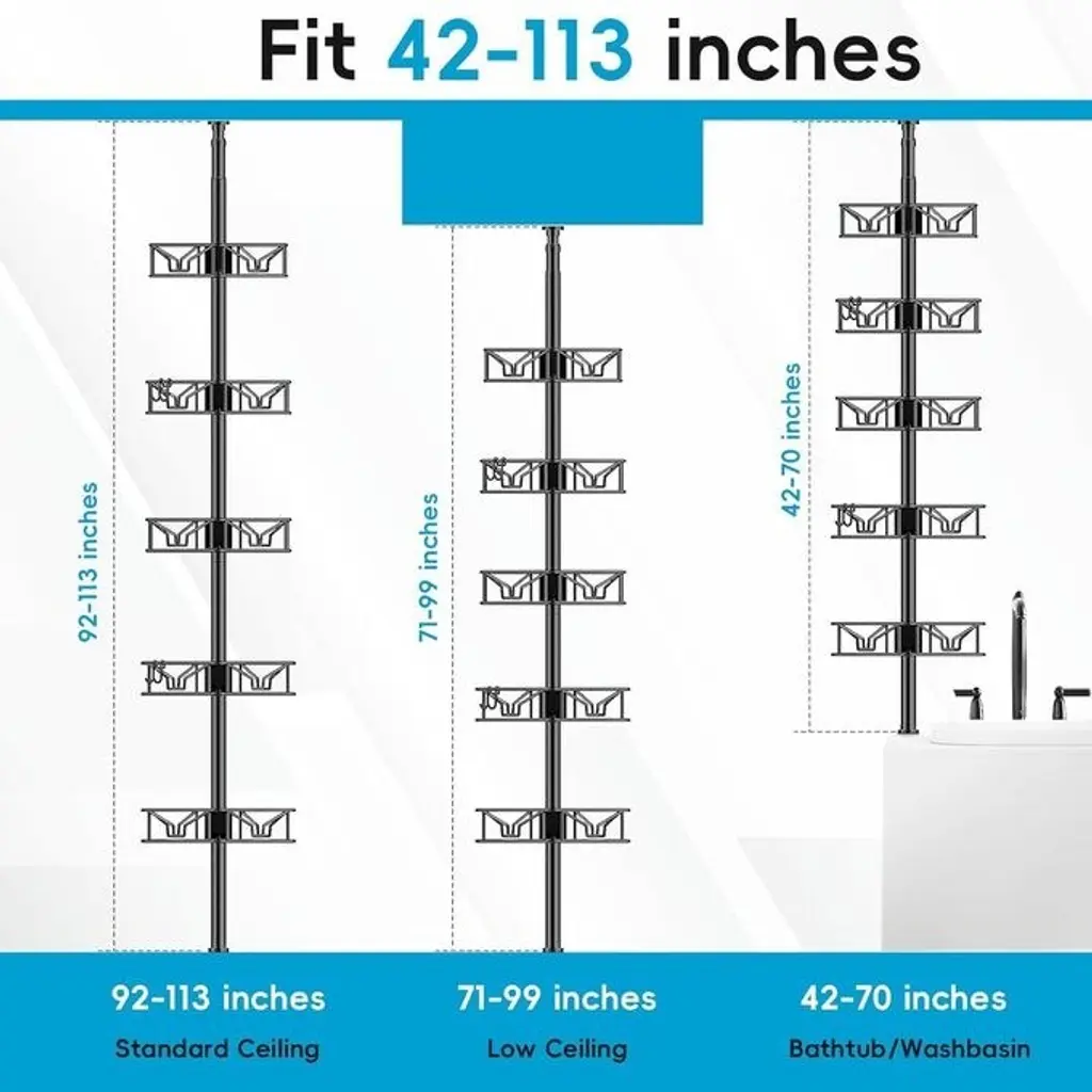 Height Adjustable:Corner Tension Rod Shower Caddy Height adjustable from 32 in. to 115 in. 8 on each 15-inch rod and a 10-inch tension rod at the top for different heights Adjustable shelves: each basket is height adjustable to hold taller shower gels Hooks and inverted slots:2 double hooks for hanging items such as towels, headbands, bath bombs and razors. An inverted slot allows shower gel to flow out quickly when squeezing the bottle. Upgraded Capacity :The capacity of the 5 baskets is larger than the other 4 baskets. The square basket also has a larger capacity than the triangular basket. Secure fit, stable positioning, no tipping over Rust Resistant:The shower rack has a rust resistant feature that ensures that the pillars and shelves will not rust and will last for a long time.