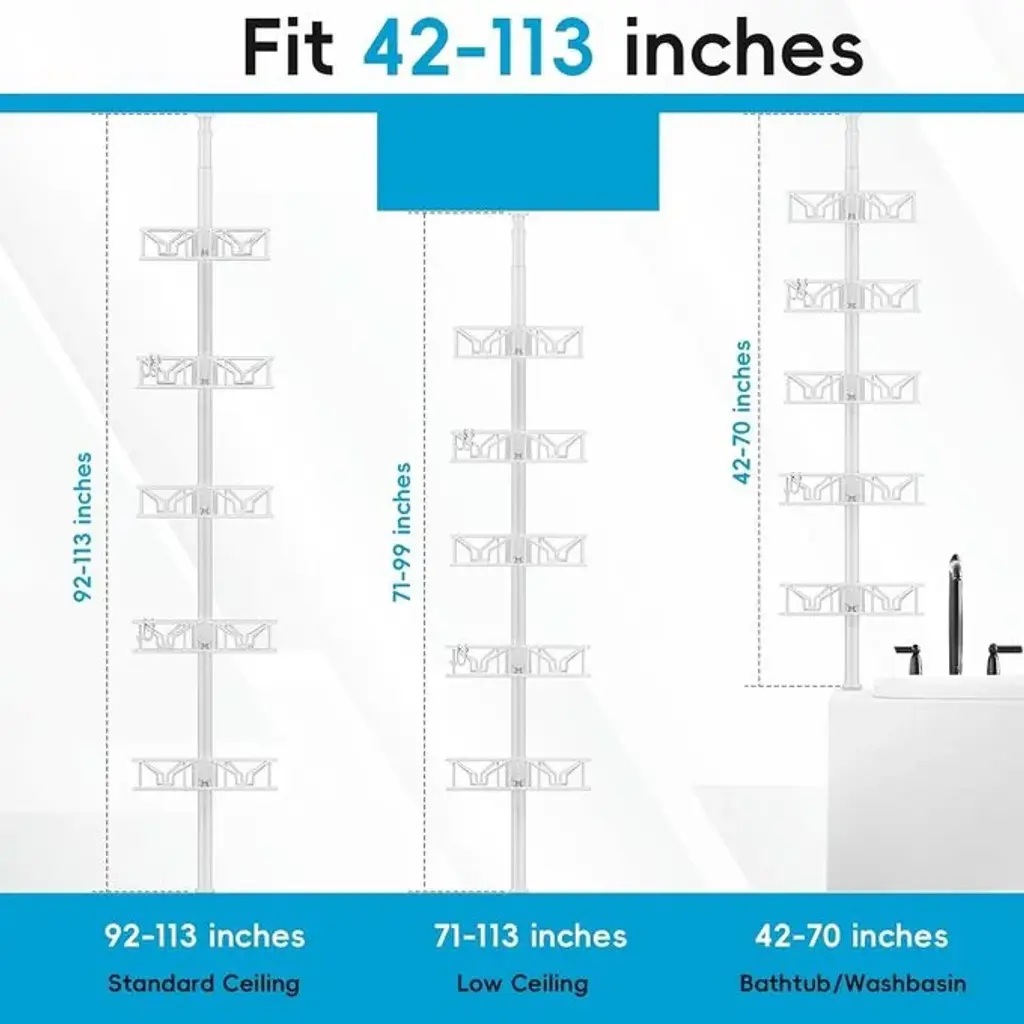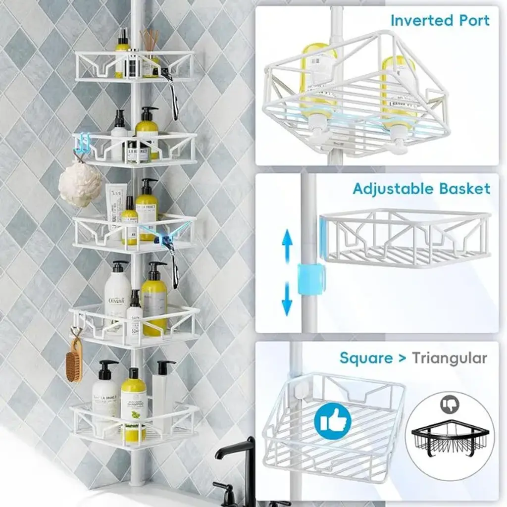 Height Adjustable:Corner Tension Rod Shower Caddy Height adjustable from 32 in. to 115 in. 8 on each 15-inch rod and a 10-inch tension rod at the top for different heights Adjustable shelves: each basket is height adjustable to hold taller shower gels Hooks and inverted slots:2 double hooks for hanging items such as towels, headbands, bath bombs and razors. An inverted slot allows shower gel to flow out quickly when squeezing the bottle. Upgraded Capacity :The capacity of the 5 baskets is larger than the other 4 baskets. The square basket also has a larger capacity than the triangular basket. Secure fit, stable positioning, no tipping over Rust Resistant:The shower rack has a rust resistant feature that ensures that the pillars and shelves will not rust and will last for a long time.