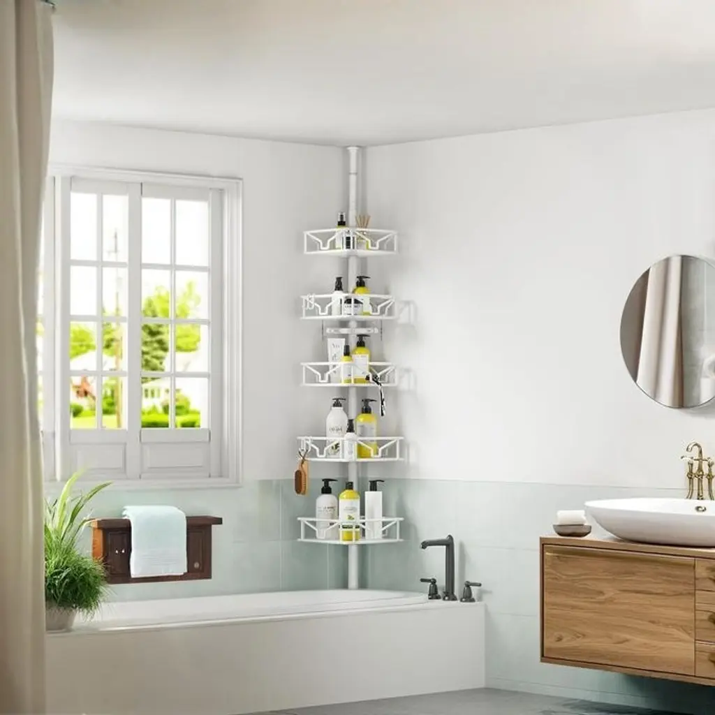 5 Tier Adjustable Corner Shower Basin With Hook Organizer Rustproof Tie Rods 62-116 In - 11.7"d X 11.7"w X 116"h - White