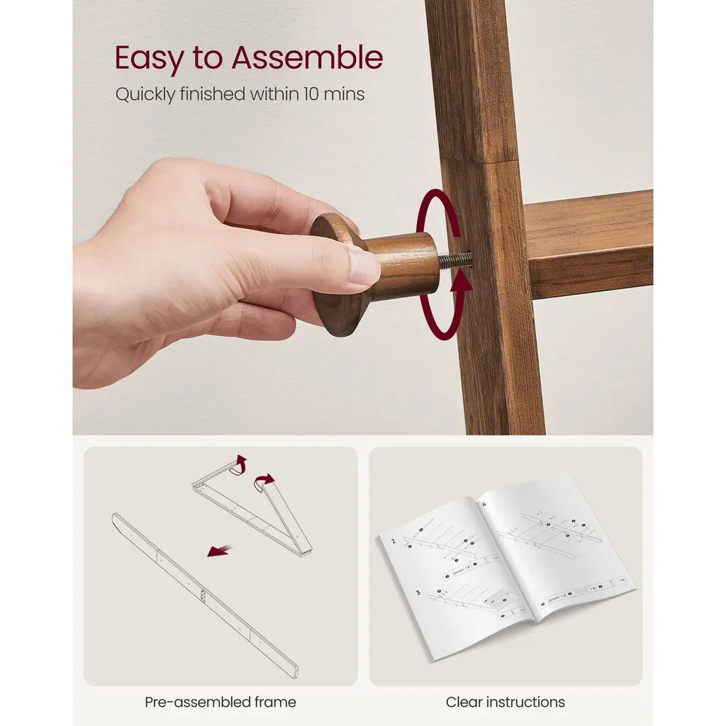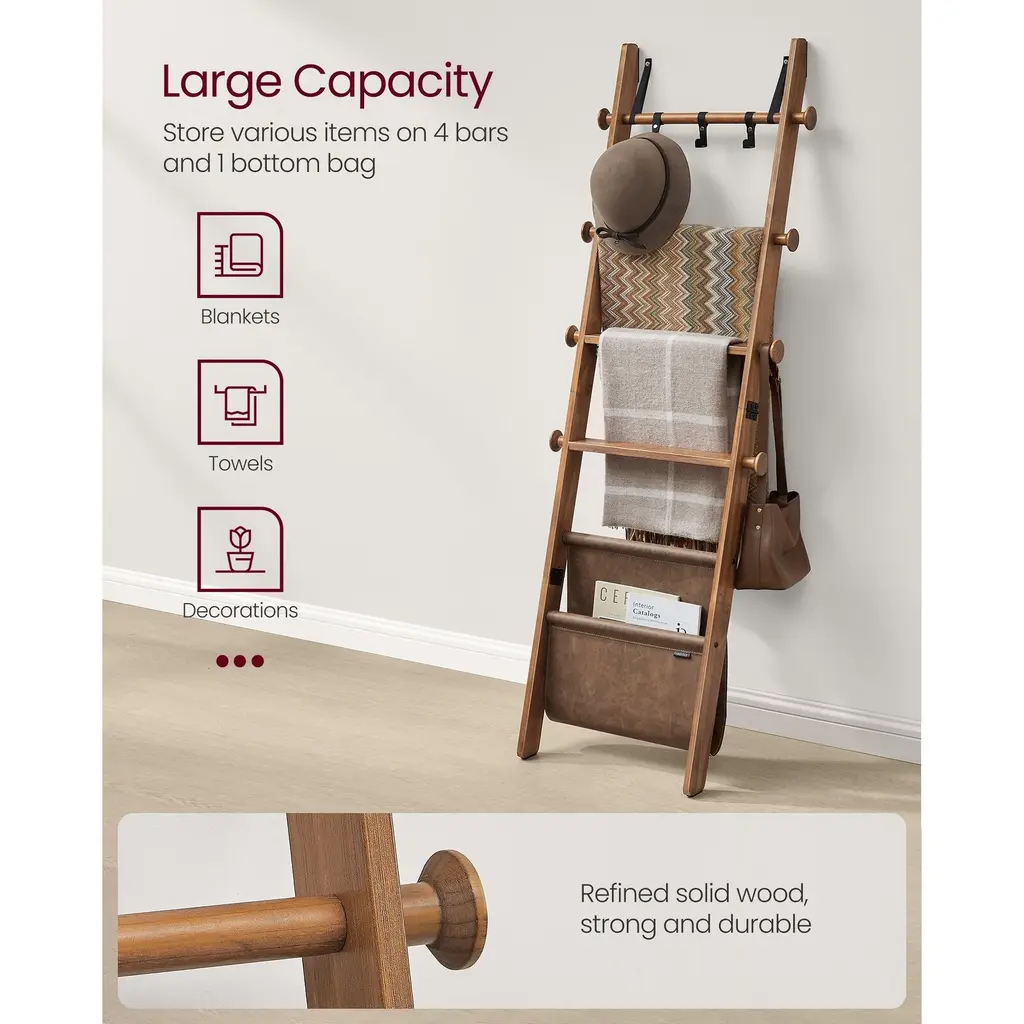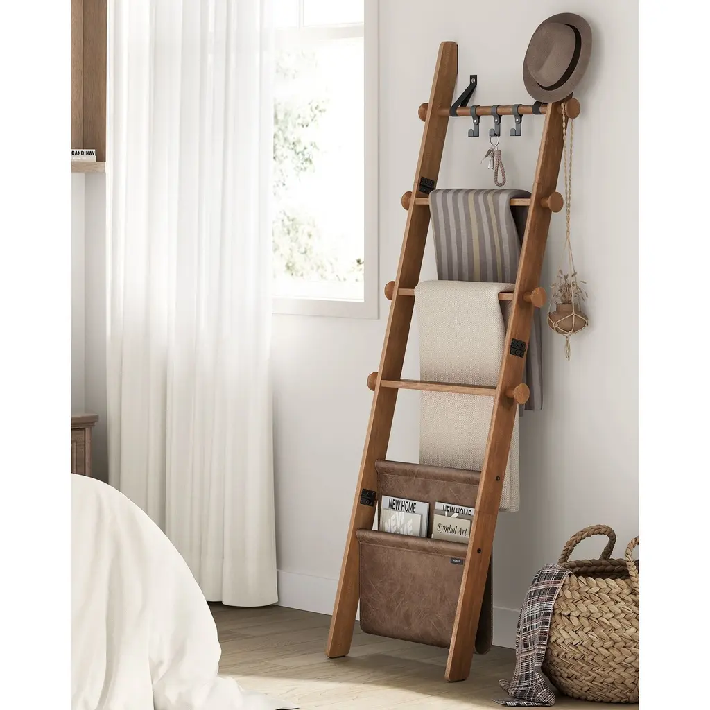 5-Tier Wooden Blanket Ladder With 8 Side Hook - 21.3"l X 15.9”w X 65"h - Caramel-Brown