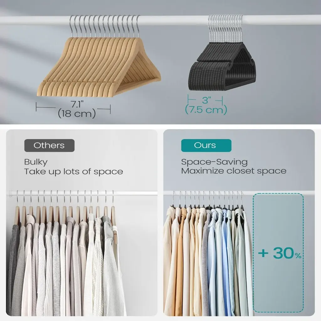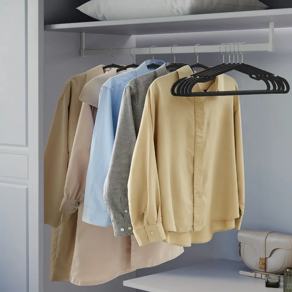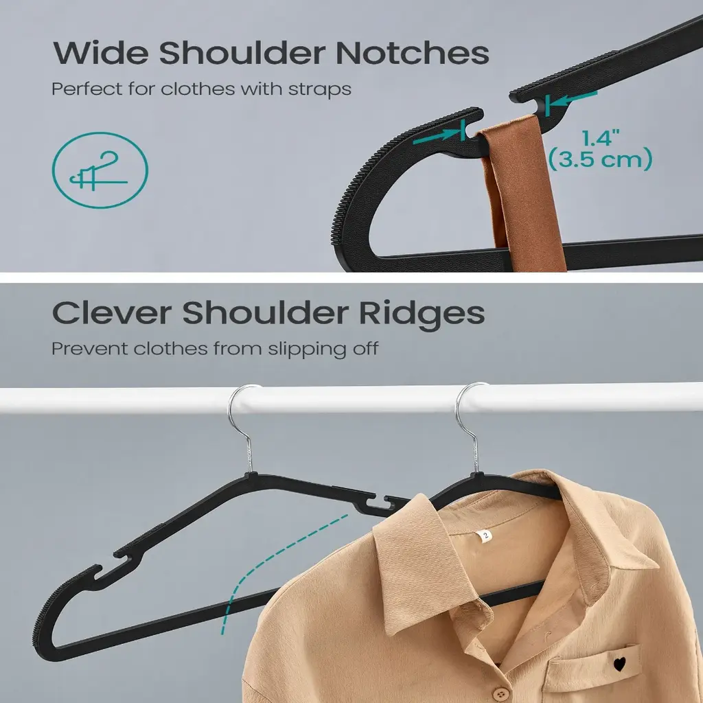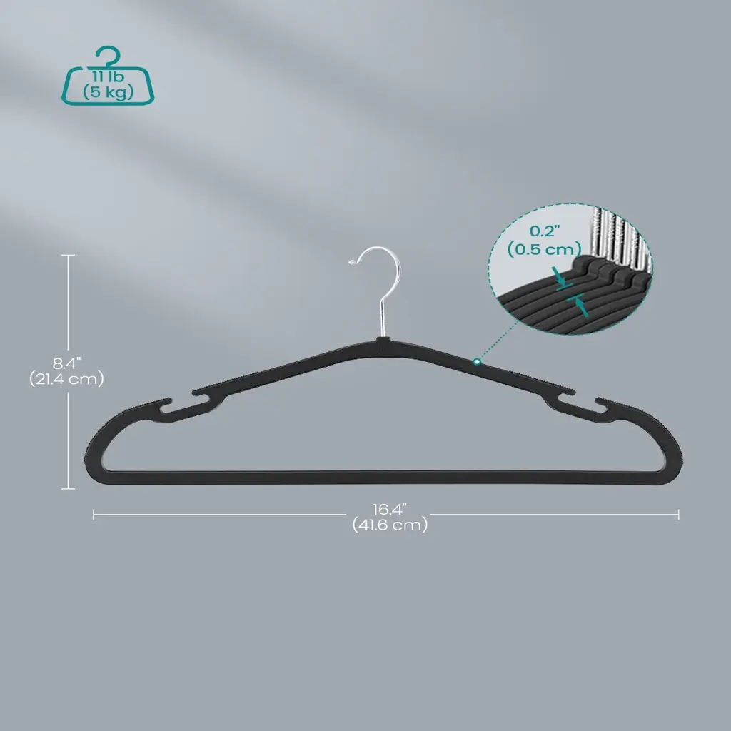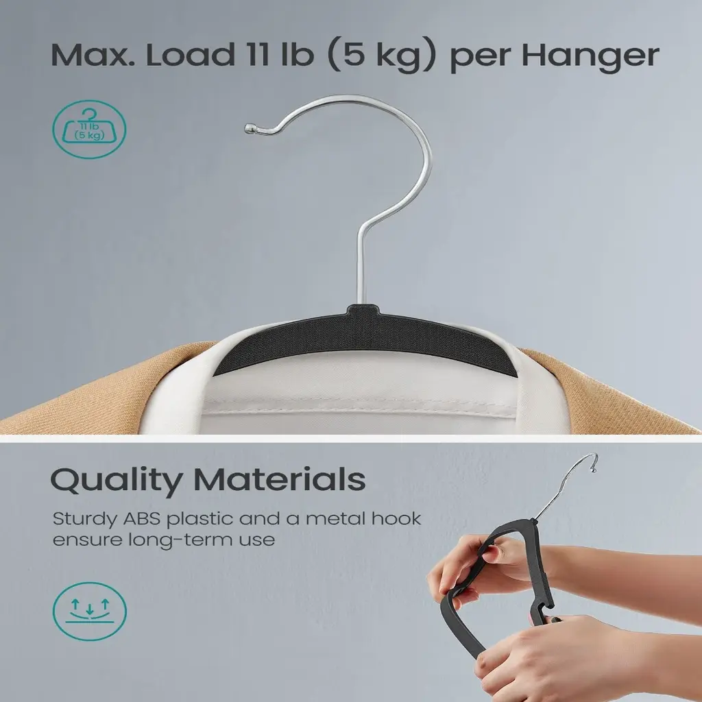 Specifications:Description: Maximize your closet efficiency with our space-saving hangers available in Cloud White, Ink Black, and Grey. Crafted from durable ABS plastic with a sturdy metal hook, each hanger measures 16.4"L x 0.2"W x 8.4"H and supports up to 11 lbs, making them perfect for heavy coats and winter garments. The clever design features wider shoulder notches to securely hold strappy clothing, while the non-slip ridges prevent garments from slipping. Enjoy a neat and tidy wardrobe with these slim hangers that won’t leave marks on your clothes. Plus, with 360° swivel hooks, organizing and accessing your clothing has never been easier. Ideal for anyone looking to enhance their closet organization!Key Features: