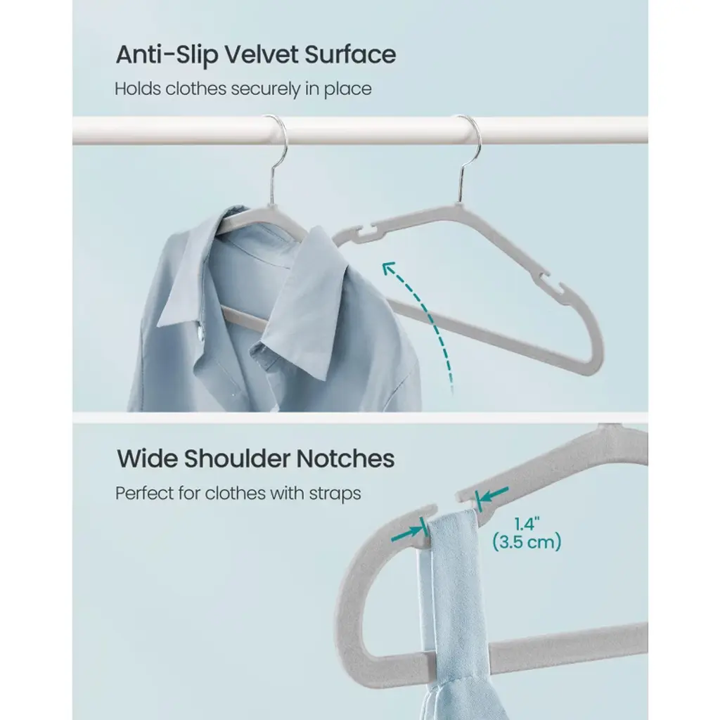 Designed for children's clothing, these 14x8 inch velvet hangers feature a non-slip surface and wide shoulder notches to securely hold delicate garments like dresses and camisoles. The sturdy ABS plastic and metal hook support up to 11 lbs per hanger, while the slim 0.2" profile maximizes closet space. With 360° swivel hooks and a gentle curved design, they help maintain clothing shape without marks, ideal for kids aged 7-15. Size per Hanger: 14"W x 8"H (35 x 20 cm) Total Weight of 50 Hangers: 5.5 lb (2.5 kg) Max. Static Load Capacity per Hanger: 11 lb (5 kg) Design Patent Pending, Appl. No. US29/941,124