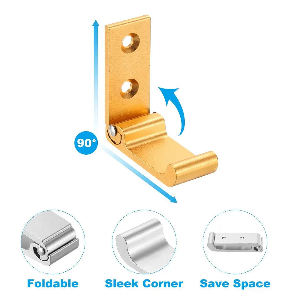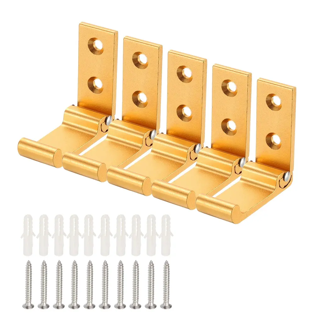 Description:[Material] These coat hooks are made from aluminum alloy which is sturdy enough to withstand heavy items, not easy to break, and can resist rust and erosion.[Space-Saving Design] The Foldable design can folded up when not in use, thus saving space. The rounded edge design will protect your hands from scratches.[Easy to Install] Each hook is reinforced with 2 strong screws. Easily mounted into solid wood or wood studs with screws.[Multipurpose] You can use these wall hanger hooks in different places, such as bedrooms, bathrooms, and closets, to hang various light items, such as dresses, clothes, headsets, and hats.Specification:Material: Aluminum AlloyColor: GoldOverall Size: 52x20x14mm/2.05"x0.79"x0.55"(L x W x T)Hole Diameter: 5mm/0.2"Hole Distance: 20mm/0.79"Package Content:5 x Folding Coat Hooks, 10 x Screws