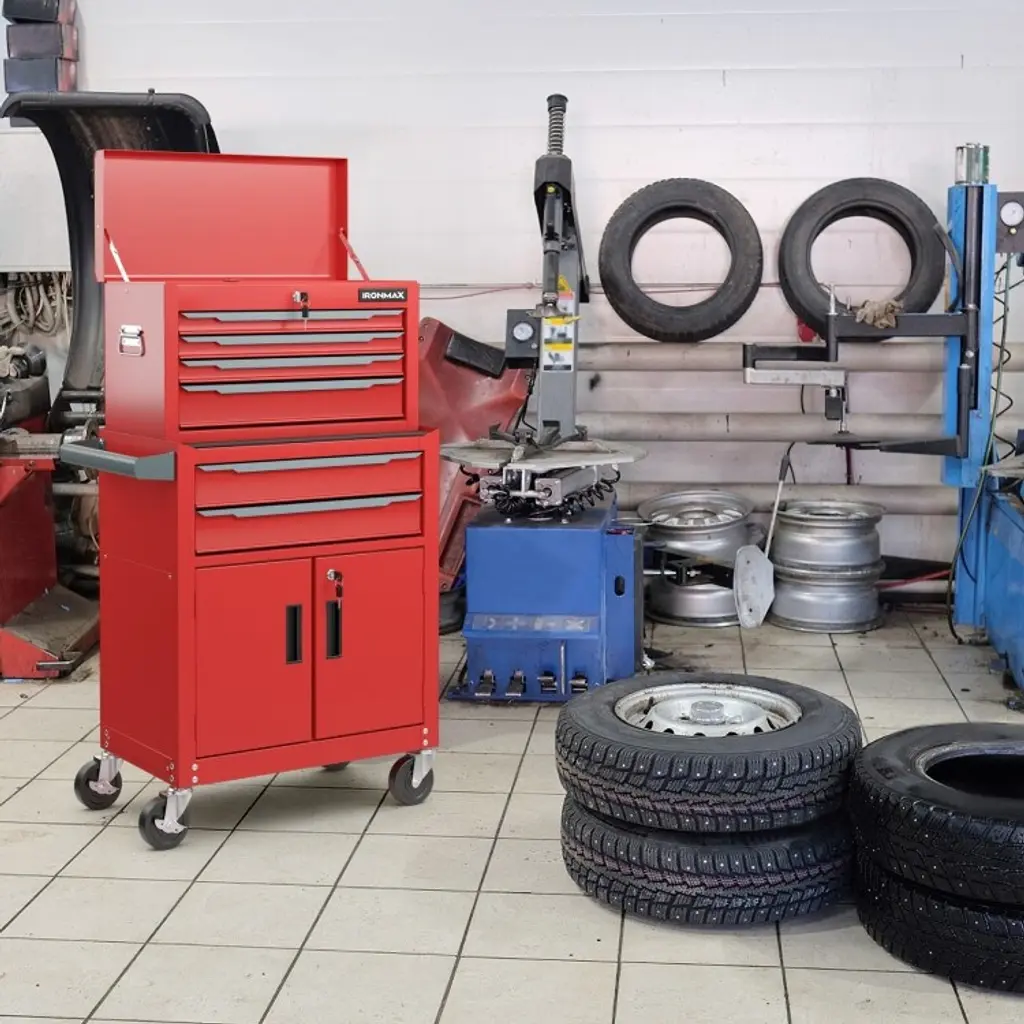 Specifications: Key Features● Upgraded Design: With 24" cabinet width, this tool storage cabinet offers more storage space. And it features larger wheels with 4" diameter and convenient handle which is thicker and more heavy-duty, thus more comfortable to grip. Overall dimension: 28" x 13" x 44" (L x W x H).● 2-in-1 Tool Chest: This rolling tool box organizer consists of 2 pieces, which can be independently used as you need. And you can detach the upper chest and put it into the bottom cabinet for saving space.● Automatic Locking Design: The drawers of top chest can be opened when the cover is lifted. Such an automatic locking system ensures high-level security. And the upper and lower locks respectively come with 2 corresponding keys. Plus, the premium ball bearing drawer slides are designed for smooth opening and closing.● Robust Metal Structure: The whole tool chest combo is mainly made of high-grade metal which is super sturdy and rustproof. Therefore, it can withstand long-time use and heavy weight up to 330 lbs.● Versatile Applicable Occasions: The tool chest comes with four 360° swiveling wheels, 2 of which are lockable, ensuring simple movement. And it will highly improve your working efficiency in auto repair shop, tool room, garage, warehouse and so on.