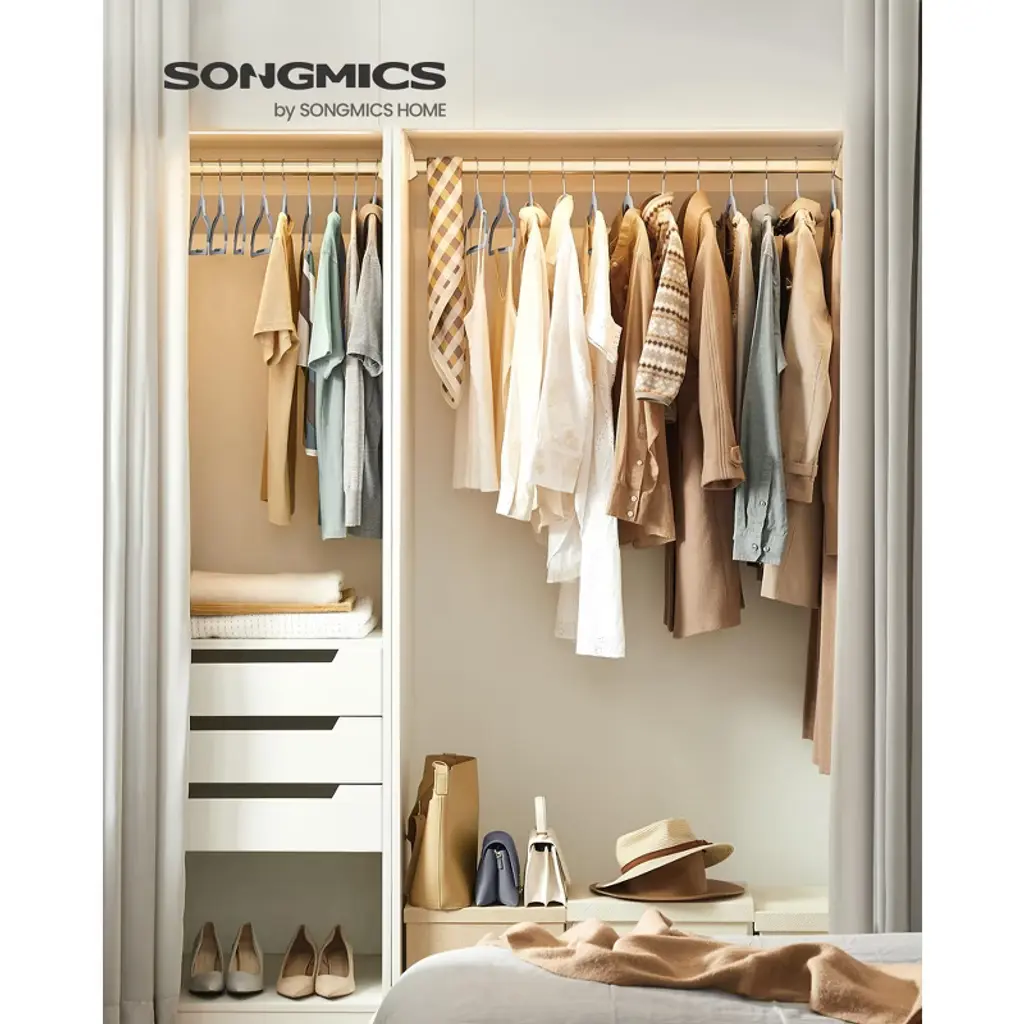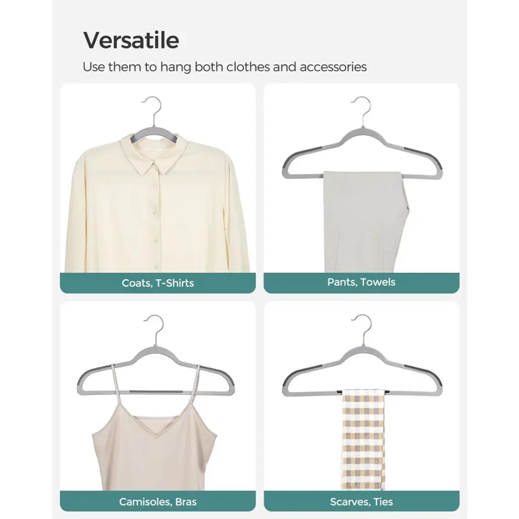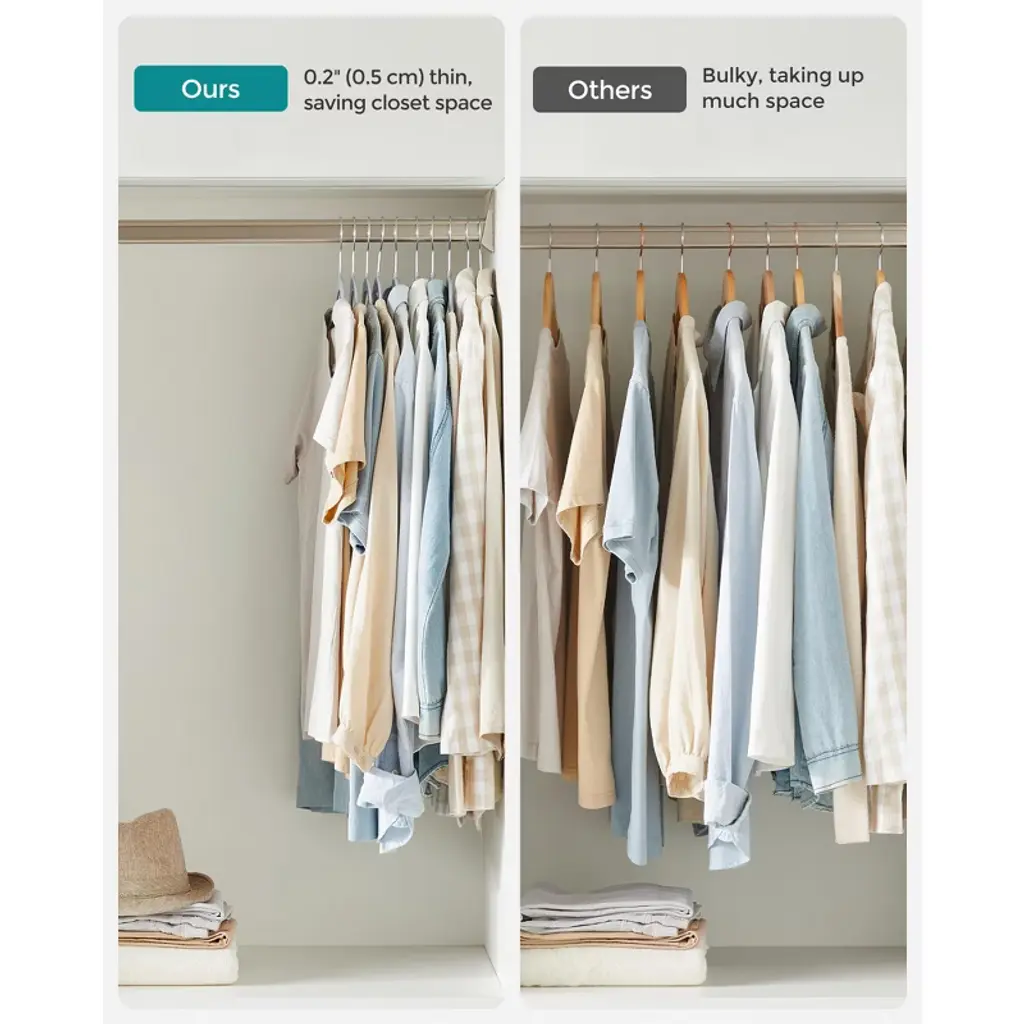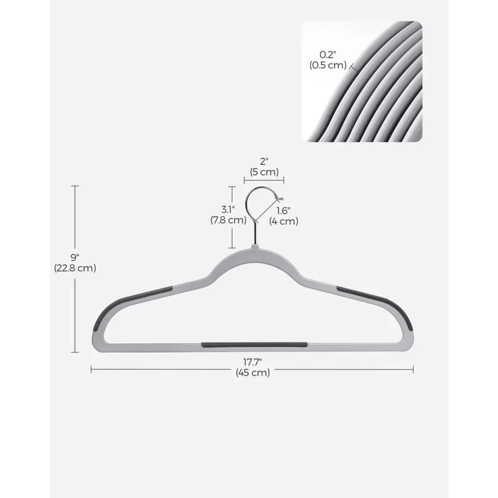 These slim plastic hangers feature a space-saving 0.2" profile and 360° swivel metal hooks for easy access and efficient closet organization. Made with durable ABS plastic and sturdy metal hooks, each hanger supports up to 11 lbs, making them suitable for heavy coats and delicate garments. The curved shoulder design helps prevent marks and keep clothes neatly stored. Size of Each Hanger: 17.7"W x 9"H (45 x 22.8 cm) Total Weight of 60 Hangers: 10.1 lb (4.6 kg) Max. Static Load Capacity of Each Hanger: 11 lb (5 kg)