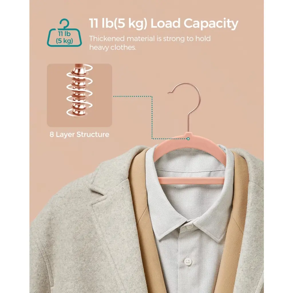 Upgrade your closet with these premium velvet hangers featuring elegant rose gold swivel hooks that rotate 360¡ã for easy access. The ultra-slim 0.2-inch profile saves up to 50% more space compared to bulky hangers, while the velvety non-slip surface keeps even delicate garments like silk dresses or satin shirts securely in place. Measuring 17.1 inches long with reinforced shoulders, they're perfect for coats, pants, ties and all clothing types. The sturdy construction prevents stretching or slipping, helping maintain garment shape while adding a touch of luxury to your wardrobe organization.