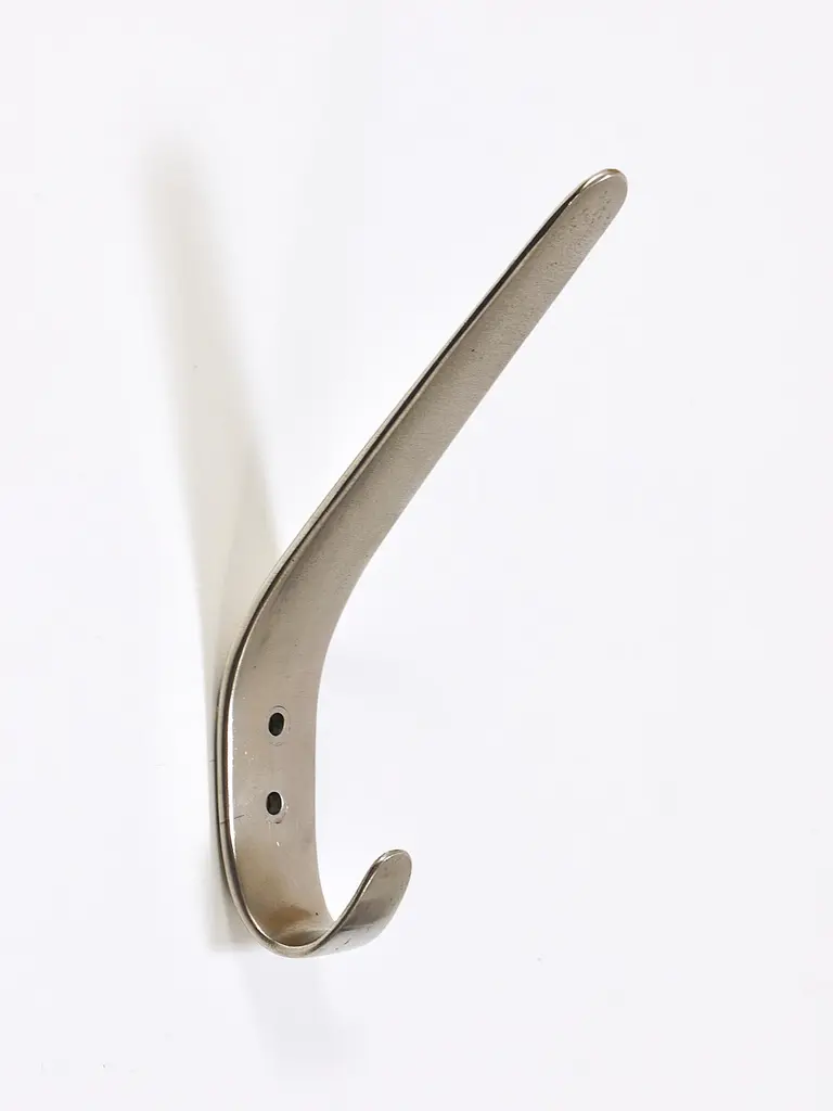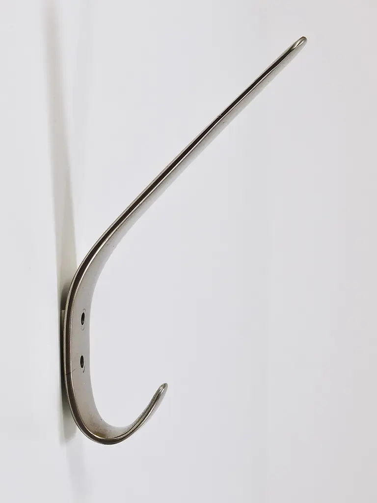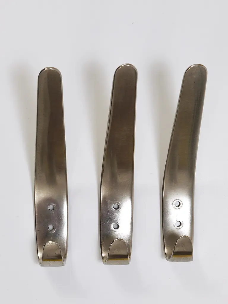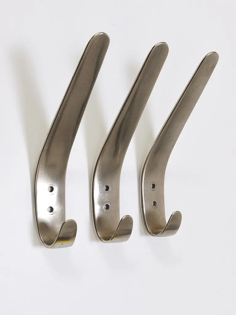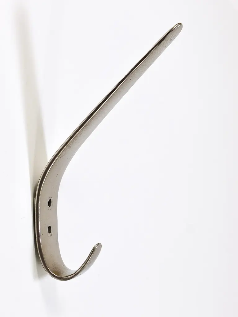 Up to 9 Midcentury brass wall hooks, model 4330, designed and executed in the 1950s by Carl Aubock II in Vienna, Austria. Sold and priced per piece. This is the more unusual nickel-plated version with its beautiful silver/nickel surface. These hooks are not that common like the ones with brass finish. They are authentic vintage wall hooks, heavy and solid. In good condition with marginal signs of age. Sold and priced per piece. We will add the matching original and also vintage screws.