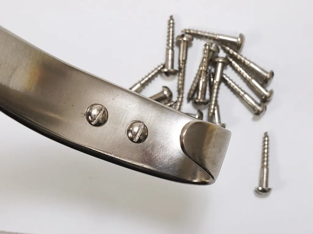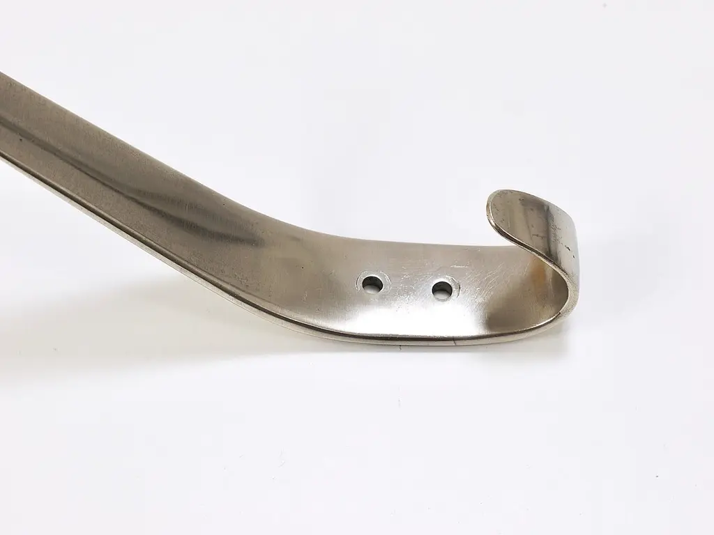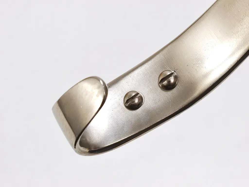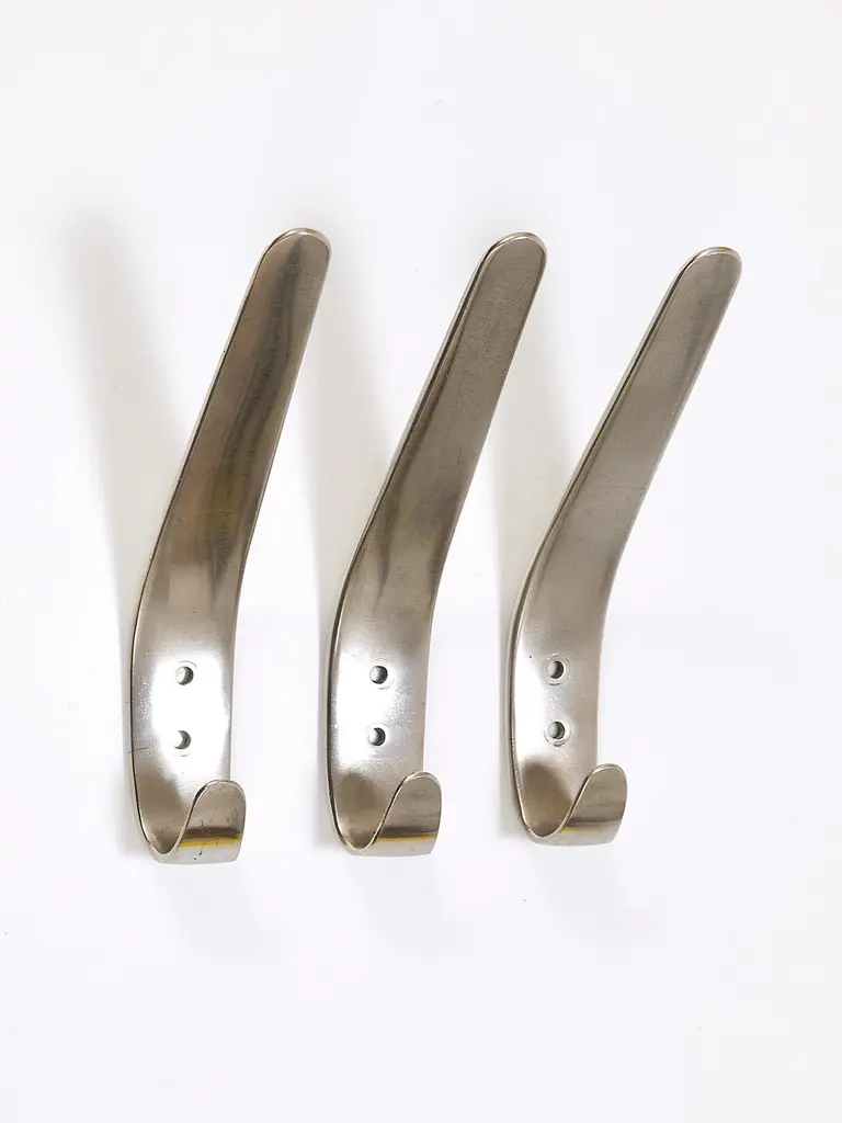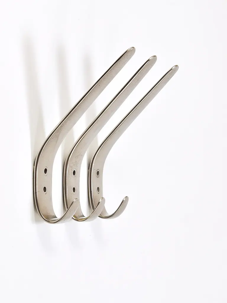 Up to 9 Midcentury brass wall hooks, model 4330, designed and executed in the 1950s by Carl Aubock II in Vienna, Austria. Sold and priced per piece. This is the more unusual nickel-plated version with its beautiful silver/nickel surface. These hooks are not that common like the ones with brass finish. They are authentic vintage wall hooks, heavy and solid. In good condition with marginal signs of age. Sold and priced per piece. We will add the matching original and also vintage screws.