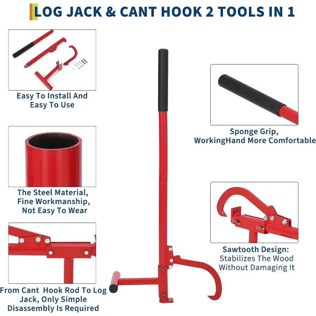 Acekool 48-inch Timberjack Log Lifter helps make firewood splitting, log rolling, and wood cutting much simpler and safer. Designed as a 2-in-1 hook and lifting tool, it lets you quickly move between lifting logs up for easy chainsaw work or rolling them out of the way. The adjustable hook grips wood of many sizes, so you can confidently handle both small and large pieces on the job. Raising logs up to 9 inches, this jack keeps your saw blades out of dirt, resulting in smoother cuts and fewer damaged tools. The non-slip base and sawtooth grip provide a steady platform on any surface, and the ergonomic handle keeps your hands comfortable during long sessions. It is portable for use at home, while camping, or around the shop, making it a valuable addition to any garage, hardware, or outdoor woodcutting equipment set. Specifications: 48-inch length, adjustable hook, lifts logs up to 9 inches, anti-slip base, ergonomic handle, portable for garage, shop, or camp use.