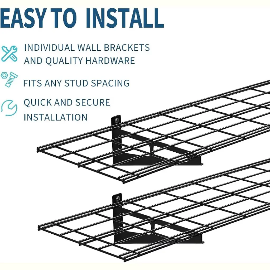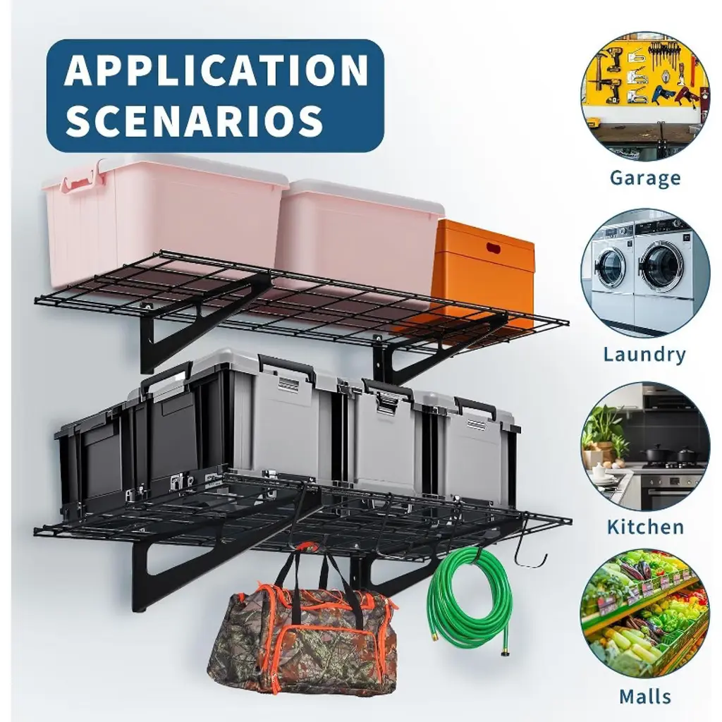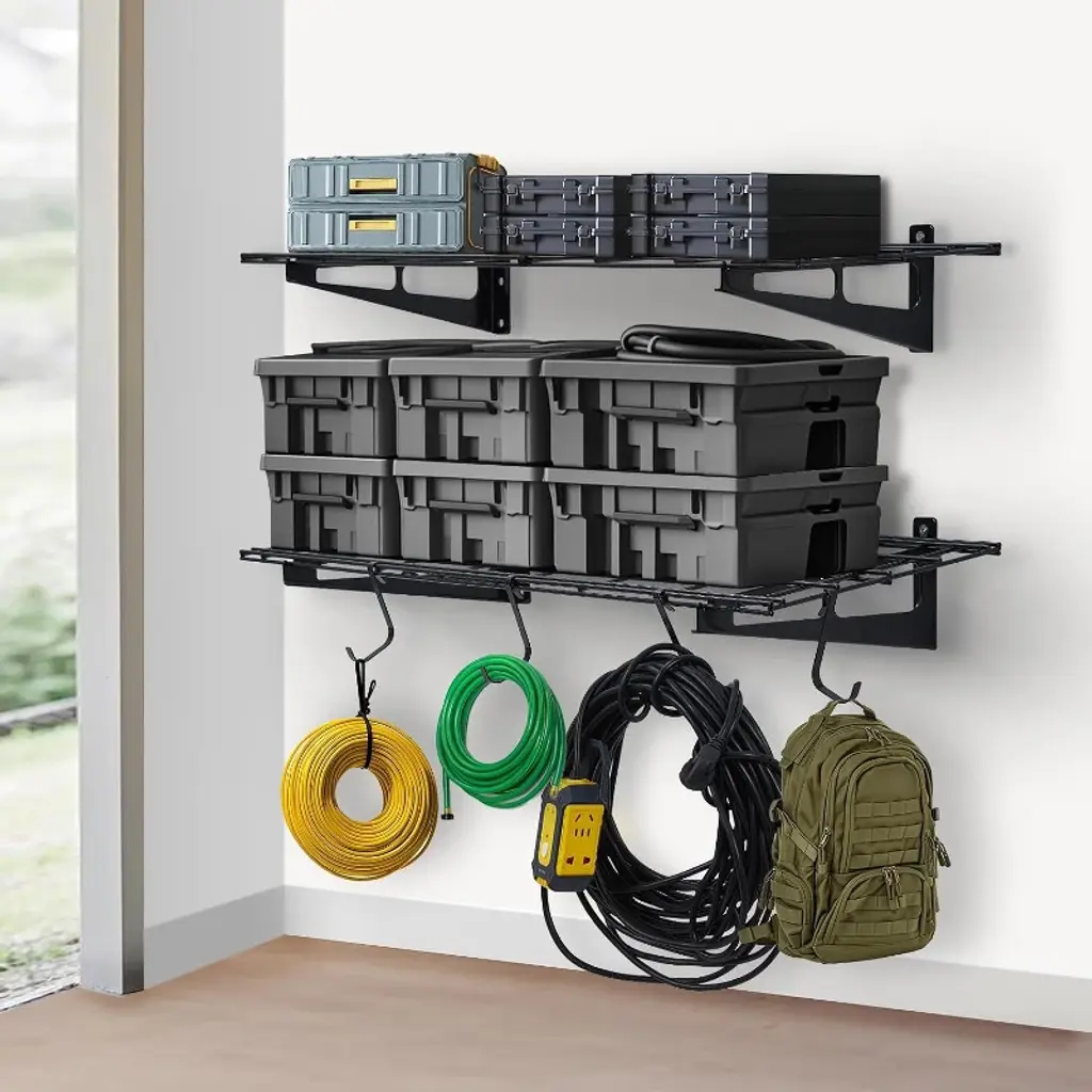The Acekool Garage Wall Shelving system offers strong and reliable storage with reinforced steel construction. Its two-tier design holds up to 200 lbs each, perfect for tools and heavy items. Triangular brackets and dual-wall anchors ensure stability and safety. Easy installation hardware fits common stud spacing. Sized at 3.87 feet by 2 feet per shelf, these shelves help organize your garage efficiently and clear floor space.